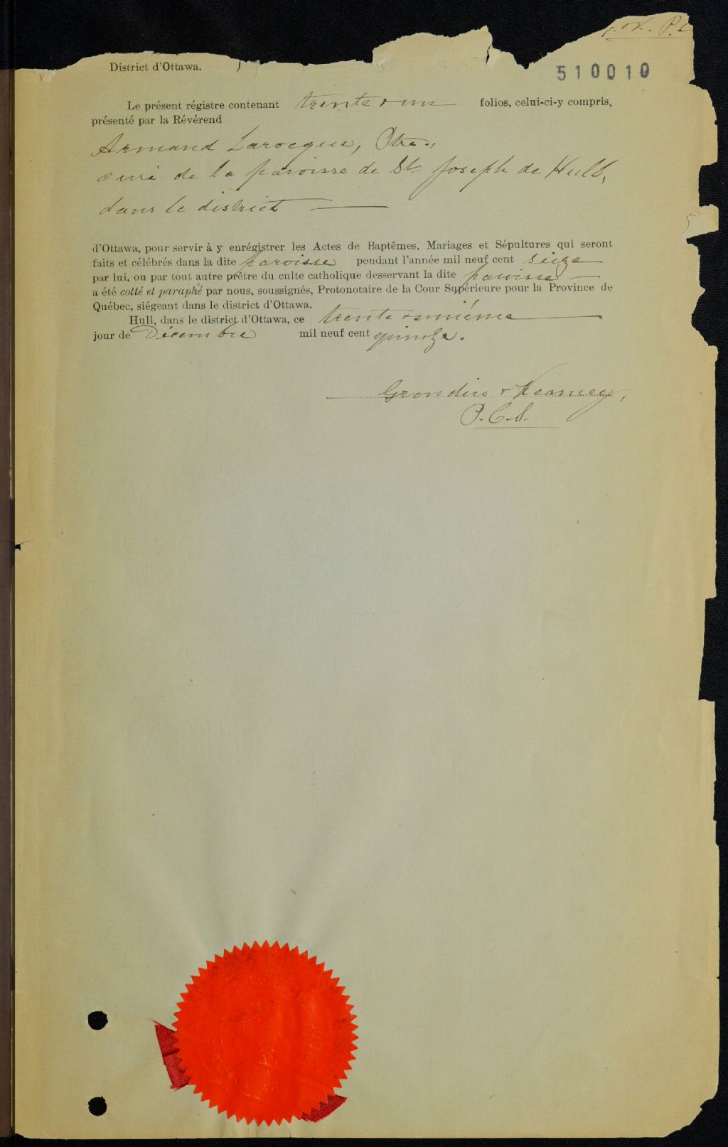 Saint-Joseph-de-Hull, 1913-1920, Archives nationales à Gatineau, Fonds Cour supérieure. District judiciaire de Hull. État civil, (07H,CE701,S69).