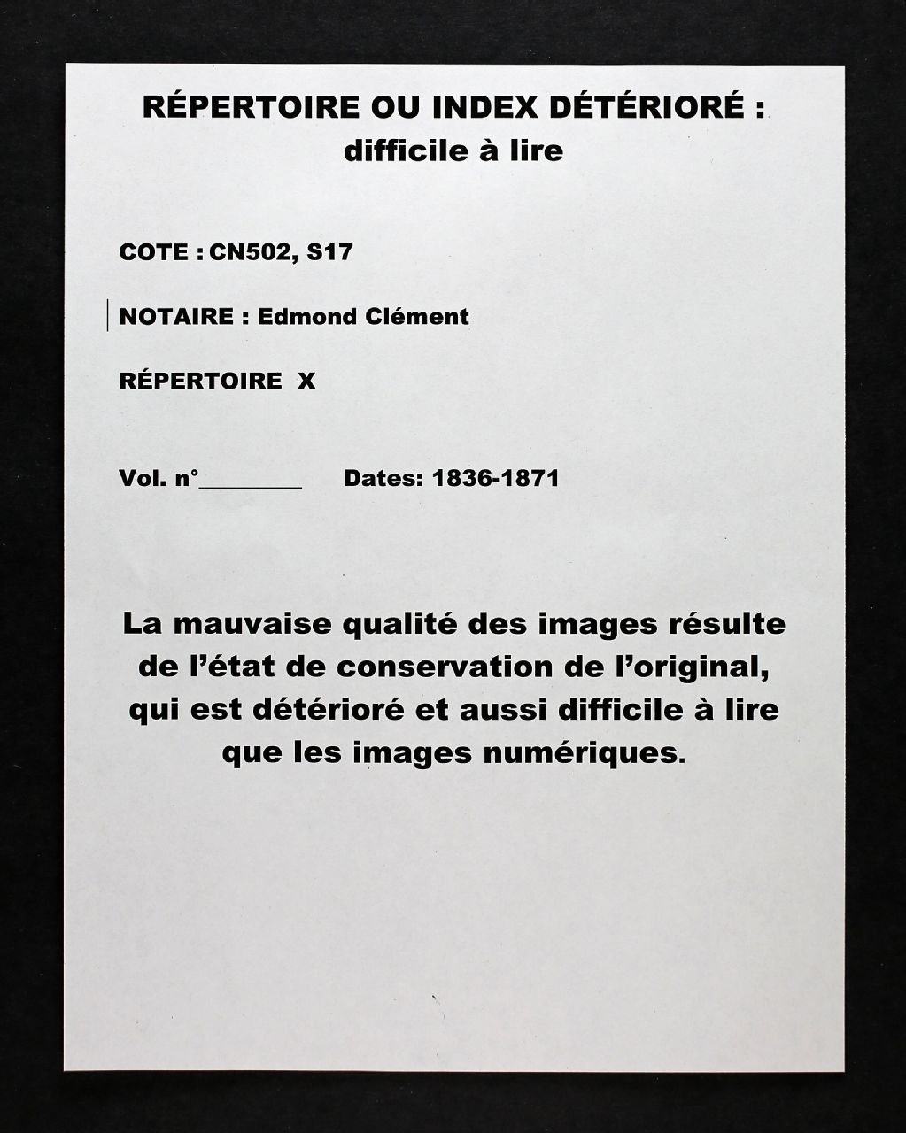 - Cette série témoigne de la vie quotidienne d'une partie de la population établie sur le territoire des Cantons-de-l'Est et des actes légaux enregistrés chez le notaire Edmond Clément. La vie économique et les moeurs et coutumes du XIXe siècle dans les Cantons-de-l'Est peuvent être étudiés à l'aide de ces documents. De plus, les liens familiaux décrits dans les actes peuvent aisément servir pour des études généalogiques. Ces minutes notariales sont issues d'une clientèle provenant de Chambly, Saint-Valentin, Saint-Athanase, Montréal, Ormstown et Farnham.Cette série contient une sous-série d'actes notariés comprenant 6340 minutes notariales, une sous-série pour le répertoire ainsi qu'une pour les index. Le répertoire est relié en une seule pièce et donne des références sur les parties impliquées dans les actes. Les documents se présentent sous une forme normalisée, c'est-à-dire selon un modèle sériel qui renferme des informations sur les parties en présence et sur la nature de l'entente contractée. Les actes sont de différents types: obligations, quittances, ratifications, ventes, et etc.