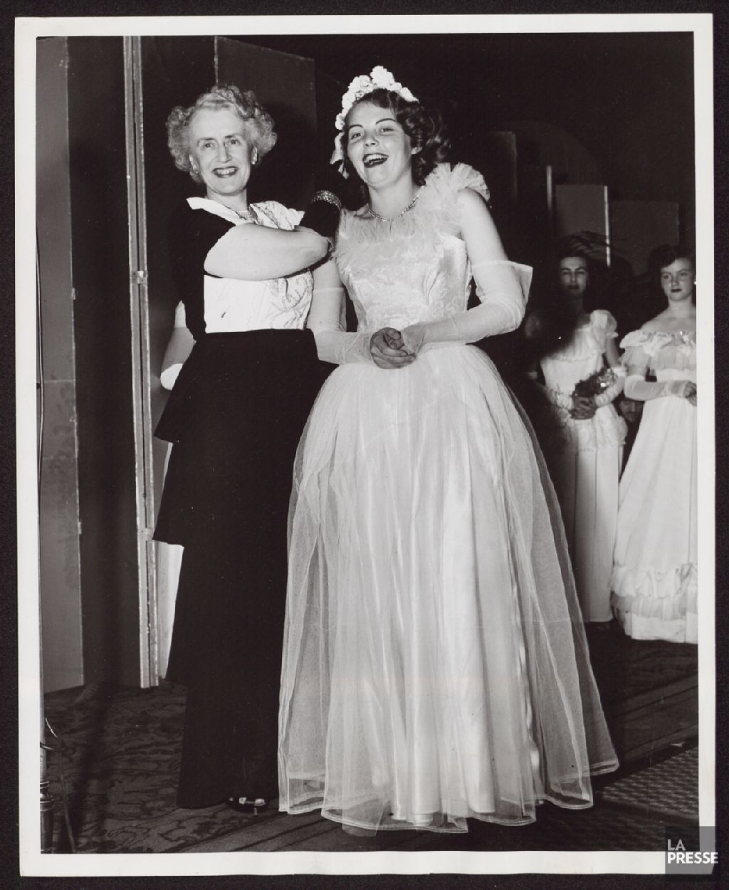 - Le dossier illustre Thérèse Casgrain couronnant Berthe Jacques lors du bal annuel des Midinettes à l'hôtel Mont-Royal