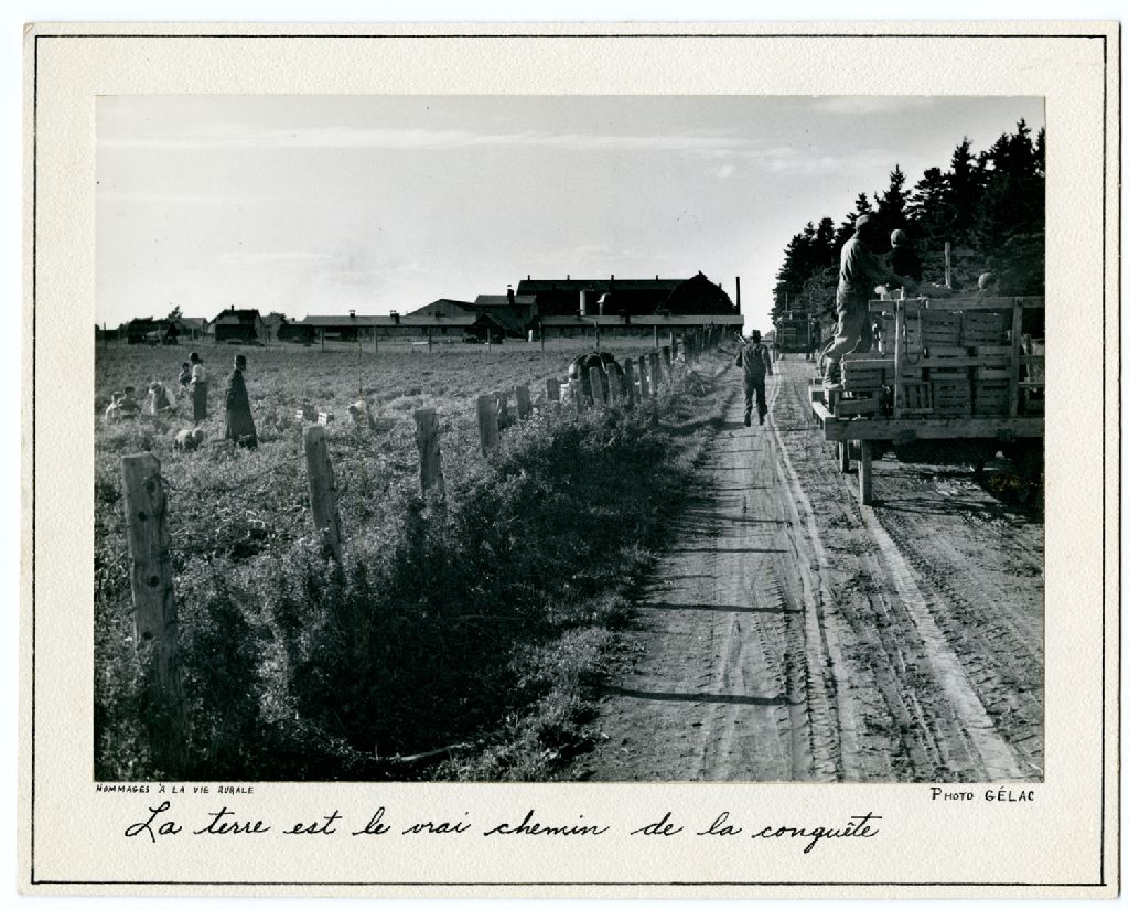 La terre est le vrai chemin de la conquête, [196-], Archives nationales à Rimouski, Fonds J.-Gérard Lacombe (En traitement), (01R,P24,S5,SS3,D144,P3), J.-Gérard Lacombe.