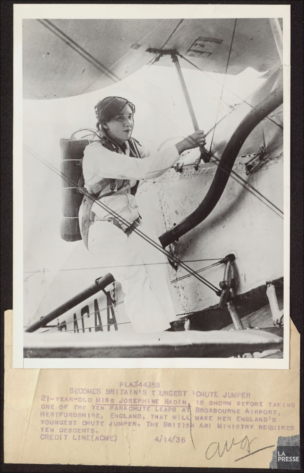 - Le dossier illustre monsieur Denois, directeur de l¿école de parachutisme professionnel de Paris, entouré d¿élèves; Josephine Nadin, plus jeune parachutiste d¿Angleterre lors d¿un saut et sur un avion; et Gwynne Johns habillé pour un saut avant de tenter de briser le record de hauteur de saut