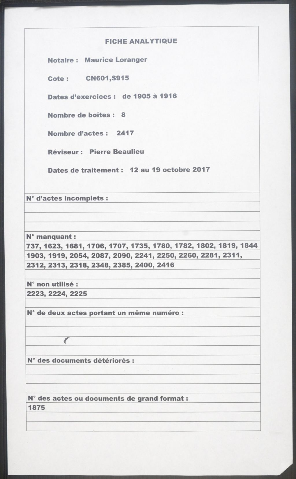 Maurice Loranger, 1905-1916, Archives nationales à Montréal, Fonds Cour supérieure. District judiciaire de Montréal. Greffes de notaires, (06M,CN601,S915).