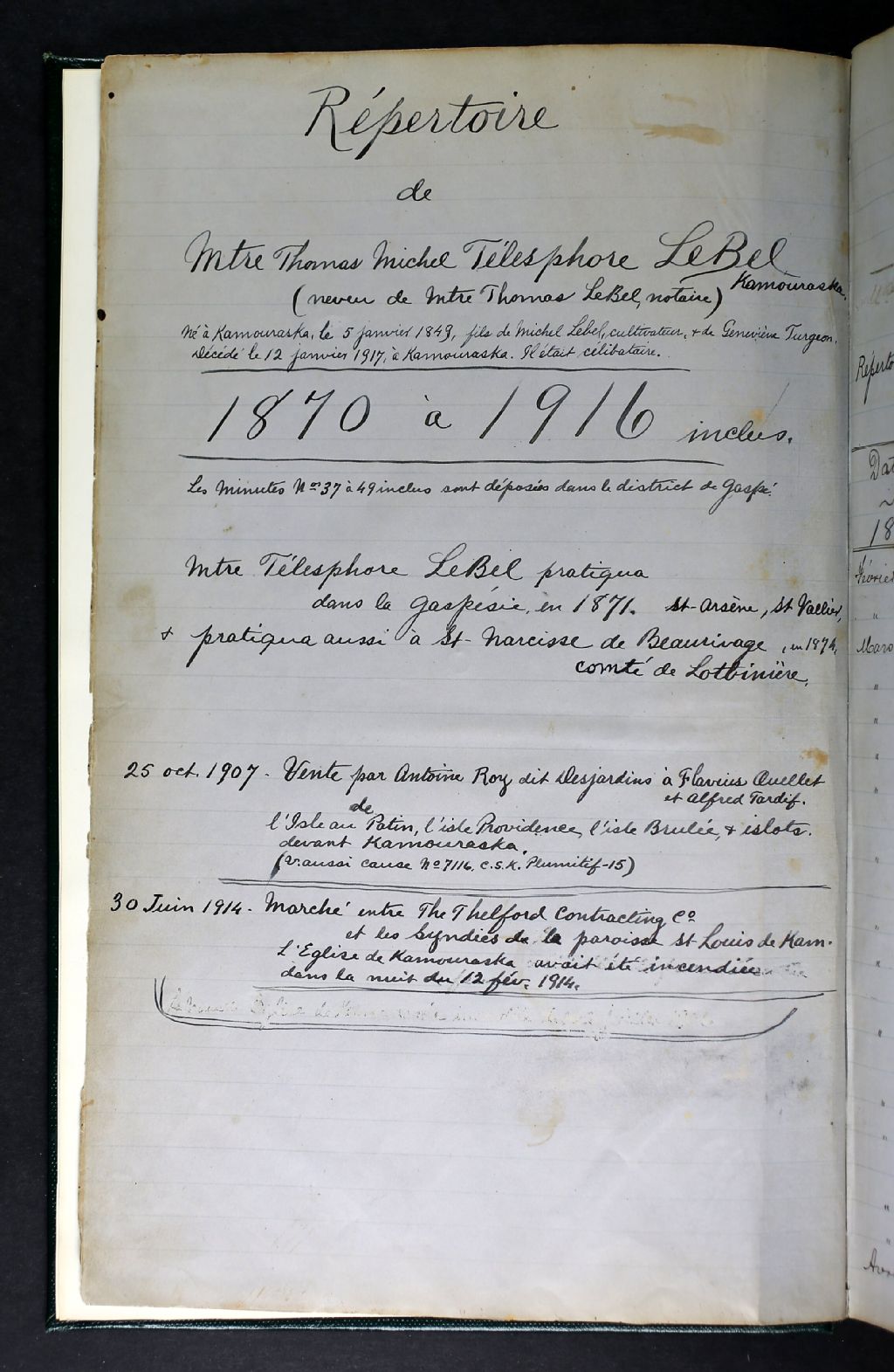 Thomas-Michel-Télesphore Lebel, 1870-1916, Archives nationales à Rimouski, Fonds Cour supérieure. District judiciaire de Kamouraska. Greffes de notaires, (01R,CN104,S73).