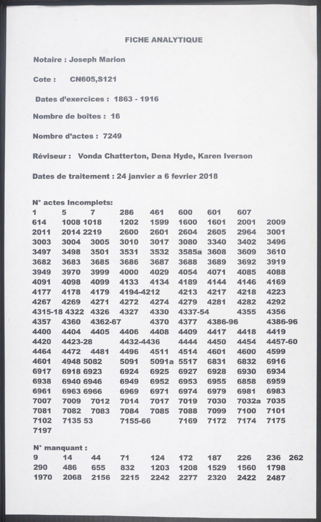 - Les minutes du notaire Joseph Marion reflètent les activités de la population de la paroisse de Saint-Paul-l'Ermite et de ses environs, où il a pratiqué tout au long de sa carrière.Source : Jean-Marie Laliberté. Index des lieux de résidence et de pratique des commis, des garde-notes, des greffiers, des tabellions, autres et des notaires, 1621-1991 ainsi que les lieux de dépôt de leurs minutiers avec leurs cotes aux A.N.Q. Montréal : J.-M. Laliberté, 1991