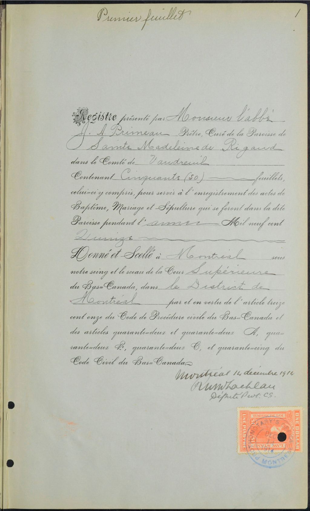 Sainte-Madeleine-de-Rigaud, 1802-1922, Archives nationales à Montréal, Fonds Cour supérieure. District judiciaire de Montréal. État civil, (06M,CE601,S45).