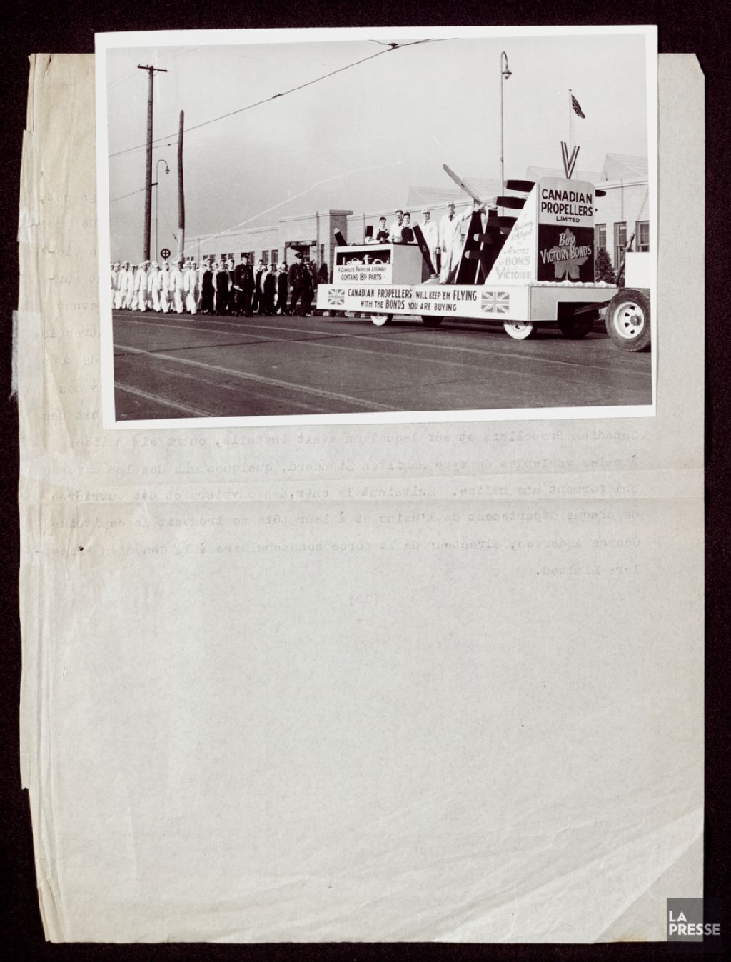 - Le dossier concerne les campagnes du quatrième et du cinquième emprunt de la victoire. On voit notamment des gens achetant des obligations, surtout des ouvriers, mais aussi des groupes d¿employés et des associations. Plusieurs documents montrent des gens travaillant à l¿effort de guerre notamment des femmes fabriquant des parachutes; des employés de la compagnie Vickers; et une parade d¿employés d¿usines de munition. Le dossier illustre des moyens de promotion de l¿emprunt dont des tramways, vitrines et affiches publicitaires; des « thermomètres » et tableaux de dons indiquant les fonds amassés; des équipes de jeunes femmes encourageant l¿achat d¿emprunts sur divers lieux de travail. On voit aussi des équipes de vente et des comités de l¿emprunt; la remise de certificats et fanions d¿honneur; des parades et tattoo militaires avec canons anti-aériens et un avion nazi capturé; des exercices de simulation d¿invasion; et les discours d¿inauguration des deux campagnes. On reconnaît, entre autres, François-Philippe Brais, Ésioff-Léon Patenaude, Adhémar Raynault, Angus Lewis Macdonald, Alphonse Raymond, Elie Lescot, Léo Richer Laflèche et Adélard Godbout