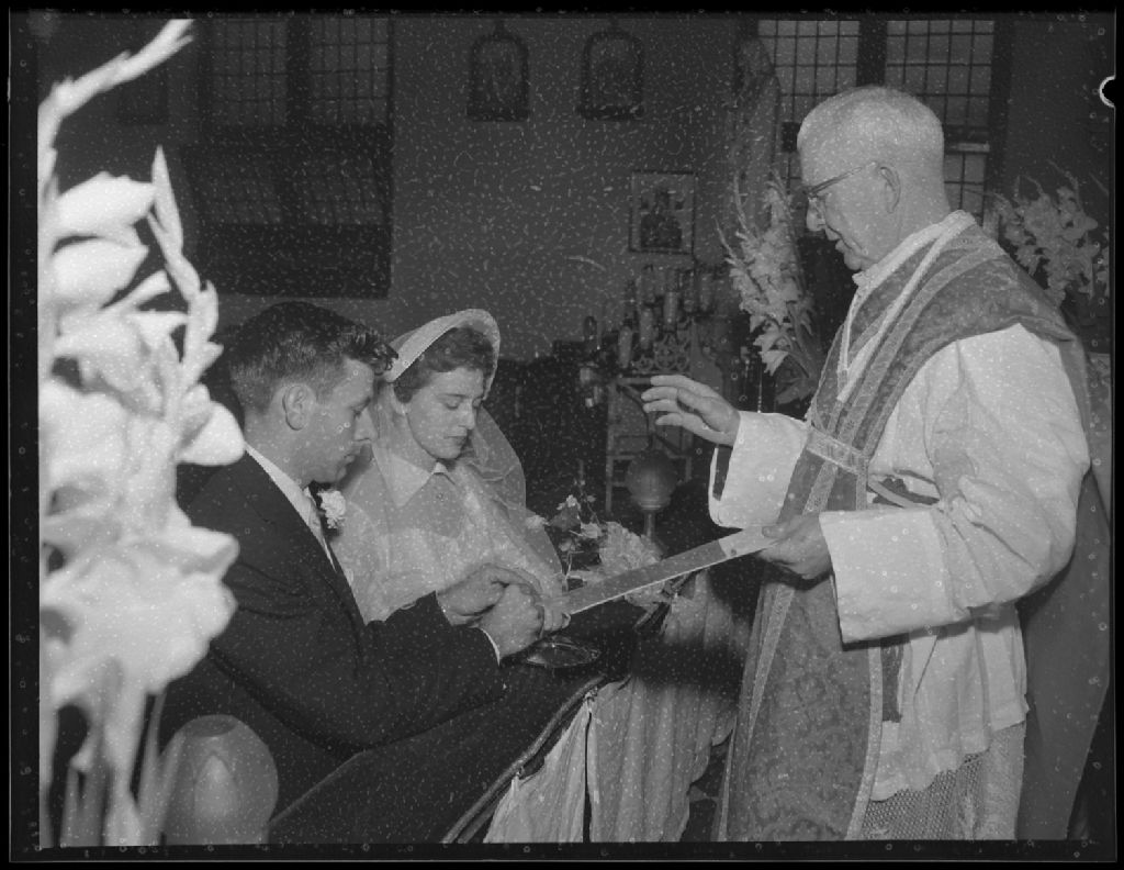 Mariage de Fernand Lawrence et de Claire Durocher à l'église Christ-Roi d'Ottawa, 24 août 1957, Archives nationales à Gatineau, Fonds Champlain Marcil, (07H,P174,S1,D12212), Marcil, Champlain.
