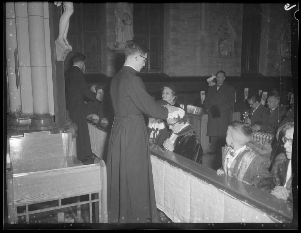 Ordinations de 3 Pères Montfortains à Notre-Dame à Eastview, 7 février 1958, Archives nationales à Gatineau, Fonds Champlain Marcil, (07H,P174,S1,D13488), Attribuée à Champlain Marcil.