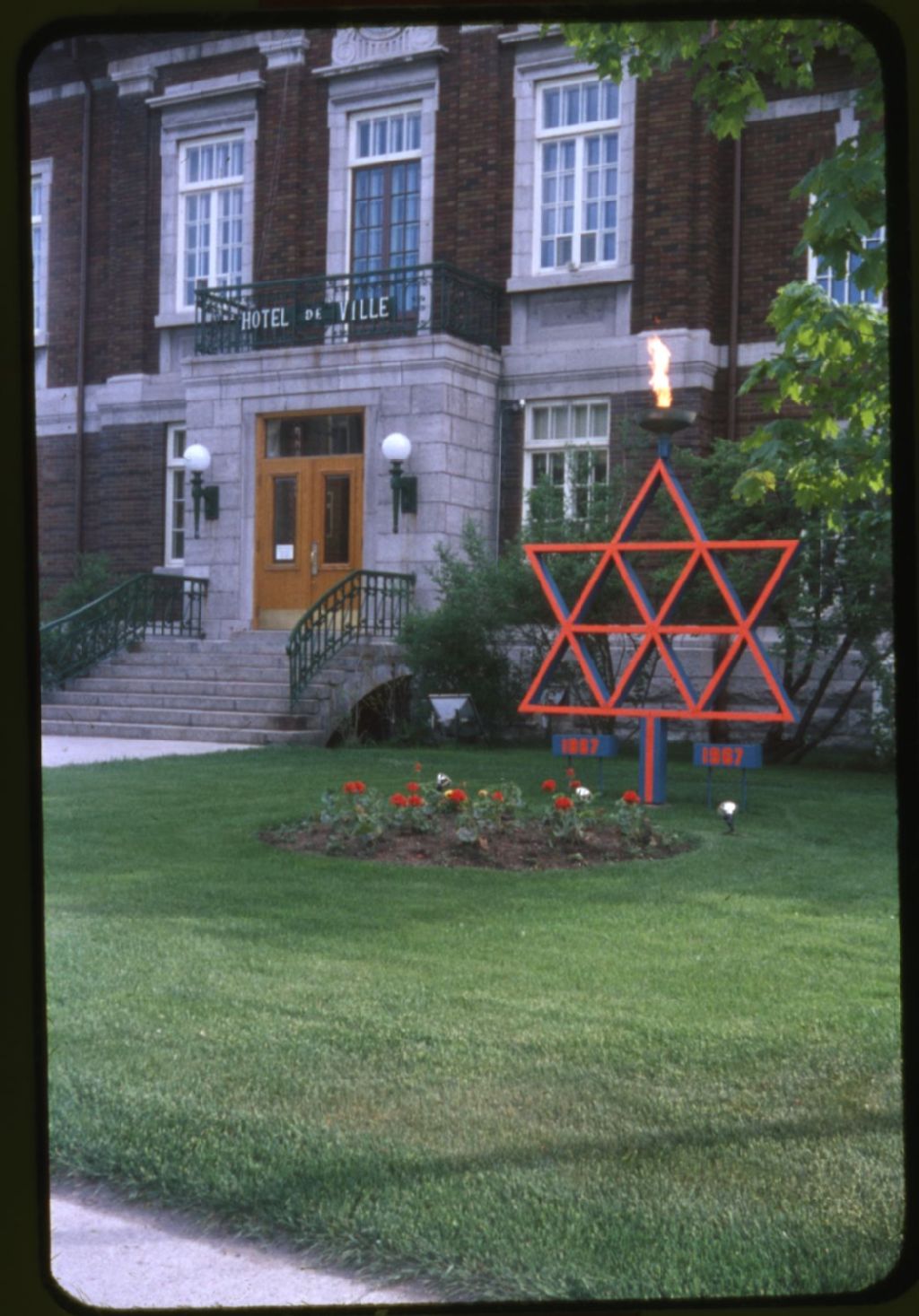 La photographie illustre l'aménagement paysagé devant l'hôtel de ville donnant sur l'avenue de la Cathédrale. On aperçoit une structure en forme d'étoile.