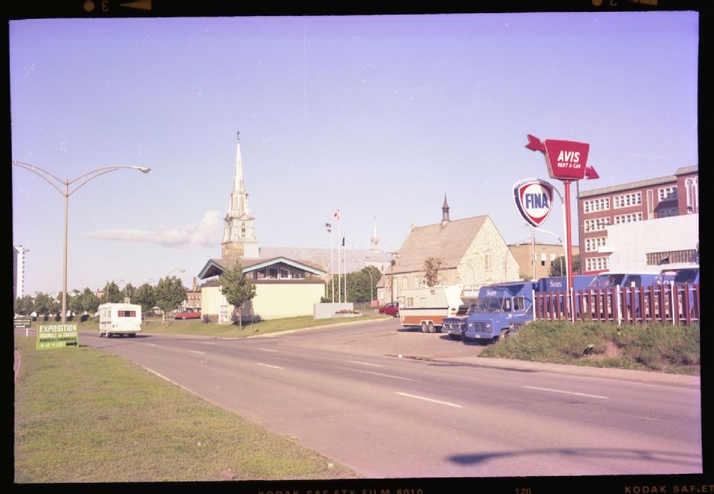 La photographie nous montre le boulevard qui passe devant le Bureau touristique de Rimouski. On aperçoit les camions de livraison de Sears, une affiche publicitaire d'une exposition au Musée régional de Rimouski et au loin la Cathédrale Saint-Germain.