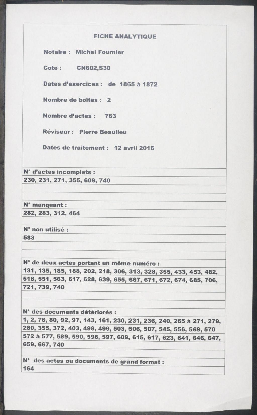 Michel Fournier, 1865-1872, Archives nationales à Montréal, Fonds Cour supérieure. District judiciaire de Saint-Hyacinthe. Greffes de notaires, (06M,CN602,S30).