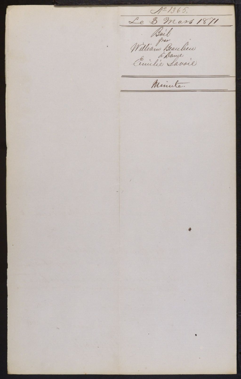 - Comprend des documents de grand format accompagnant les actes suivants :N¿ 1985 (12 mars 1872 -- Deed of sale by Mrs Hardoin Lionais [Henriette Moreau] to James Key Springle) : Plan of property belonging the the Heirs Mc Namee & Moreau situate at the Current St. Mary, Montreal / H.M. Perrault, 19 novembre 1851 -- 44 x 114 cmN¿ 2140 (16 mai 1872 -- Transaction & vente par Dame H. Lionais [Henriette Moreau] à Joseph Brunet) : Plan of Sherbrooke Street continuation, Papineau Road to Colborne Avenue, 1871 -- 50 x 63 cmN¿ 10148 (30 novembre 1887 -- Vente par Hormisdas Joly & A. Joly & Cie à Joseph Louis Barré) : Plan d'une propriété située dans le Village Incorporé de la Cote St-Louis appartenant à J.L. Barré / J. Emile Vanier, 23 novembre 1887 -- 49 x 81 cm