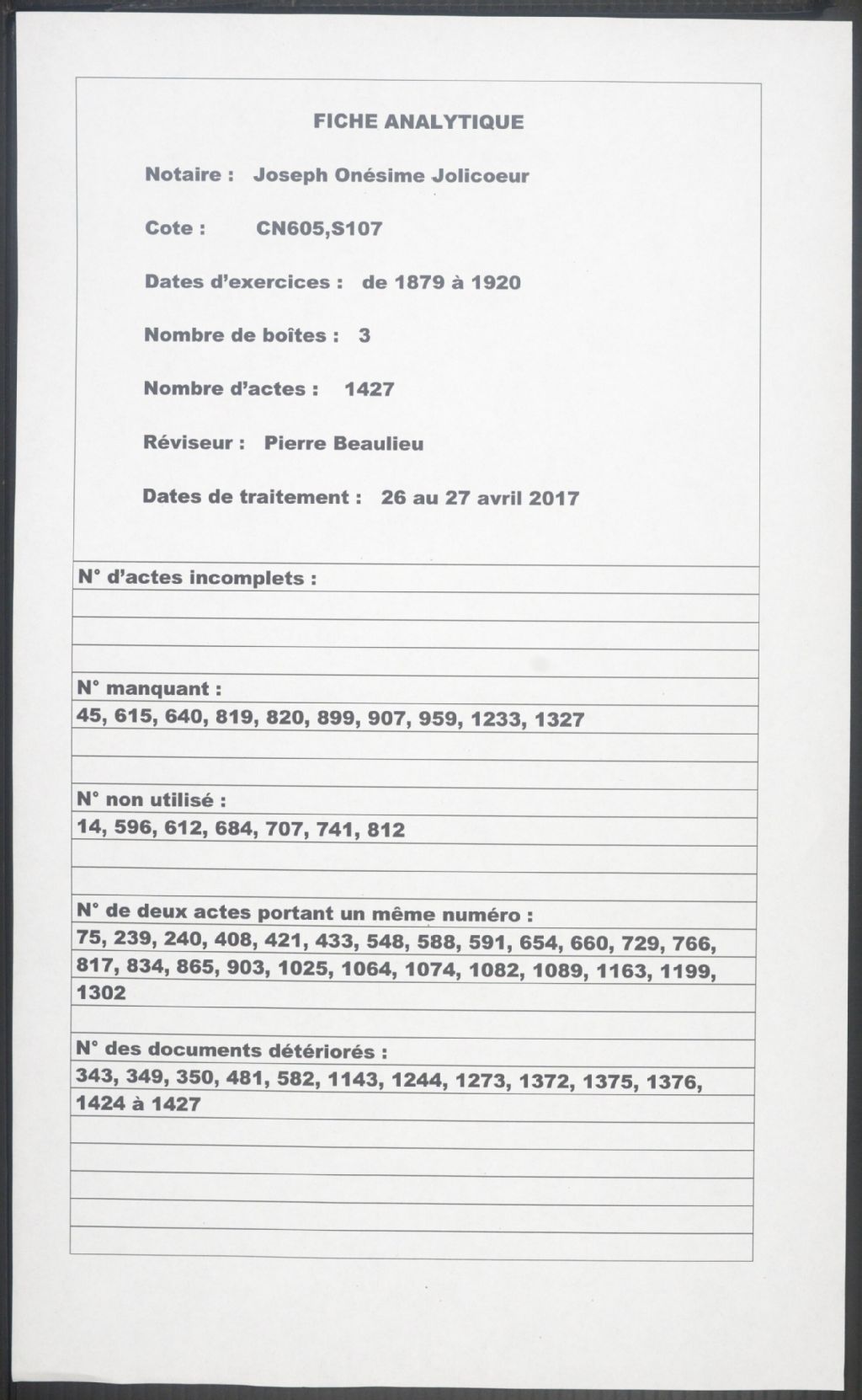 Joseph Onésime Jolicoeur, 1879-1920, Archives nationales à Montréal, Fonds Cour supérieure. District judiciaire de Joliette. Greffes de notaires, (06M,CN605,S107).