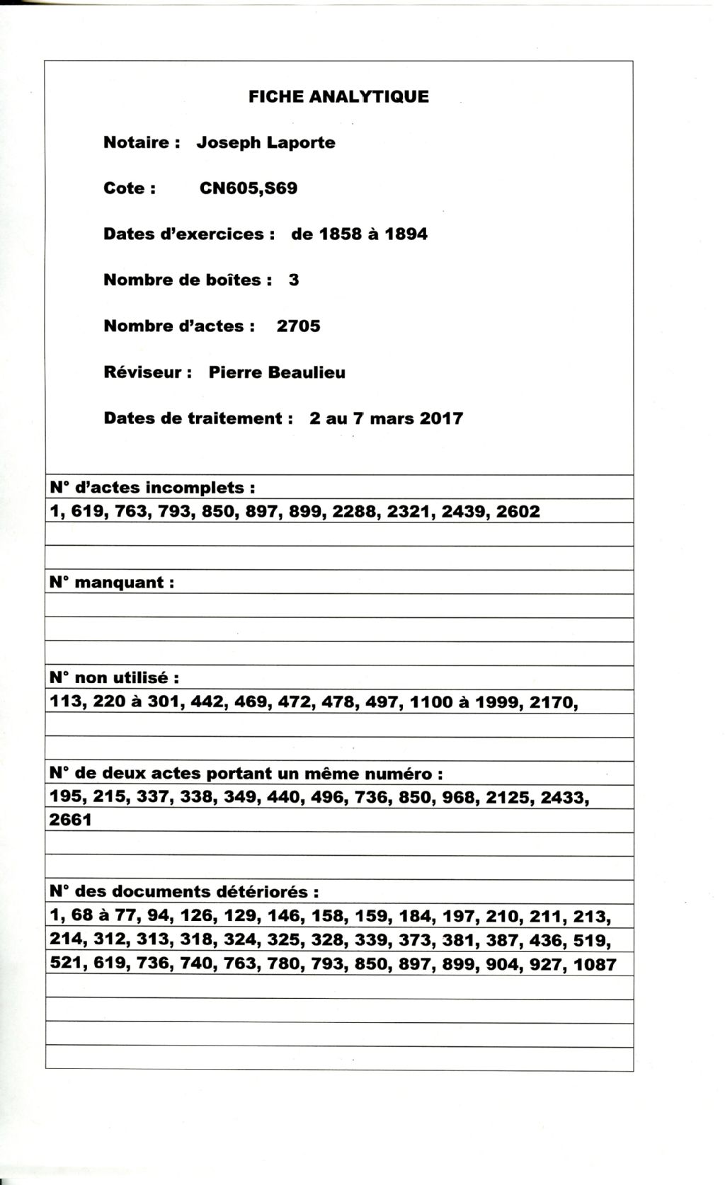 Joseph Laporte, 1858-1894, Archives nationales à Montréal, Fonds Cour supérieure. District judiciaire de Joliette. Greffes de notaires, (06M,CN605,S69).