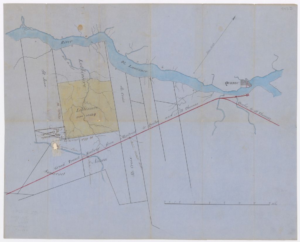 Sur ce plan de la seigneurie de Lotbinière figurent une parties des seigneuries de Sainte-Croix et Deschaillons, du fleuve Saint-Laurent ainsi que des rivières du Chêne et Bécancour, les cantons Somerset et Nelson, le chemin de fer, les stations ferroviaires, les phares, la limite des cantons et des seigneuries ainsi que le nom Grand Trunk Rly. Lotbinière délimité en jaune.