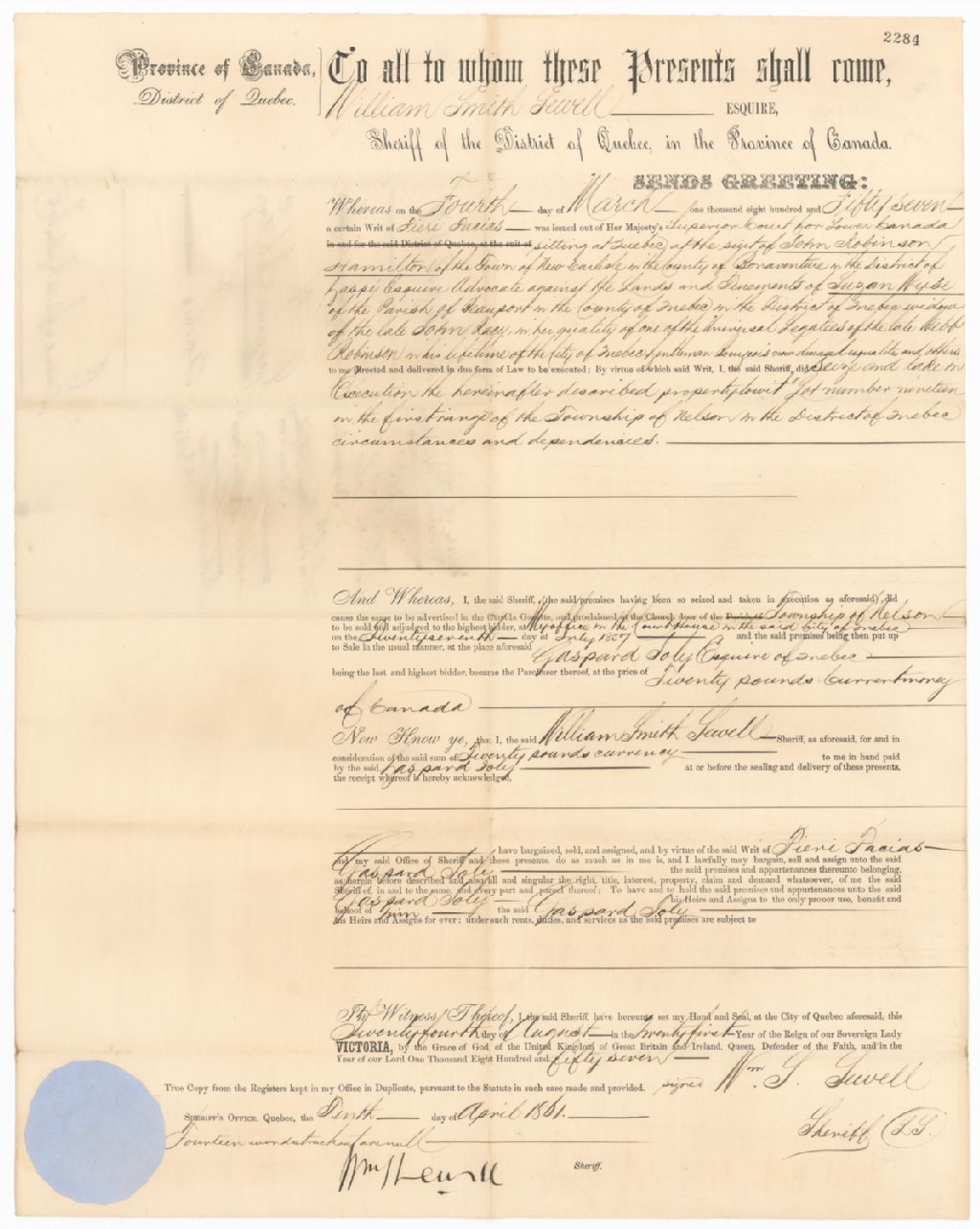 Contrat de vente de terre dans le township (canton) de Nelson en faveur de Gustave Joly, 24 août 1857, Archives nationales à Québec, Fonds Famille Joly de Lotbinière, (03Q,P351,S3,P2284).