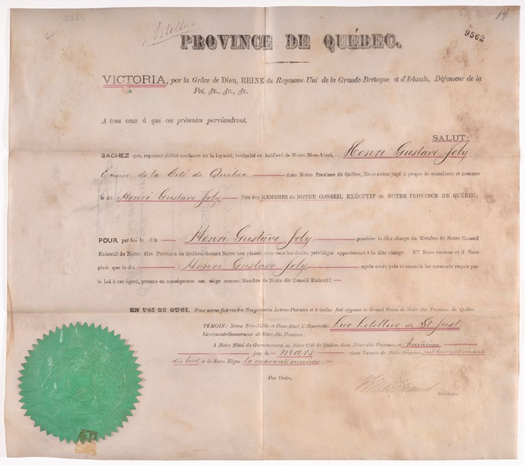 Commission nommant Henri-Gustave Joly membre du conseil exécutif de la province de Québec, 1878, Archives nationales à Québec, Fonds Famille Joly de Lotbinière, (03Q,P351,S4,SS2,P9562).