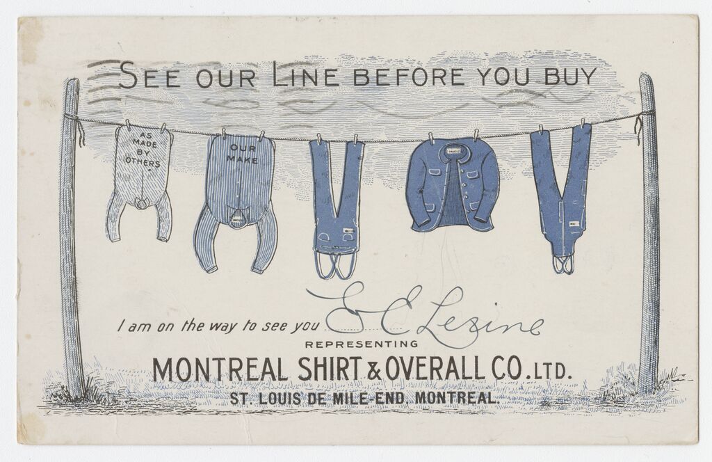 See our line before you buy : I am on the way to see you, representing Montreal Shirt & Overall Co. Ltd., St. Louis de Mile-End, Montreal