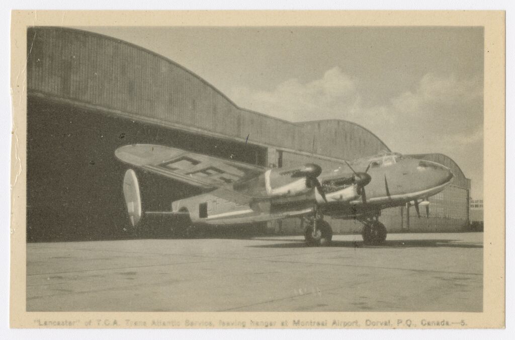 Lancaster of T.C.A., Trans Atlantic Service, leaving hangar at Montreal Airport, Dorval, P.Q., Canada