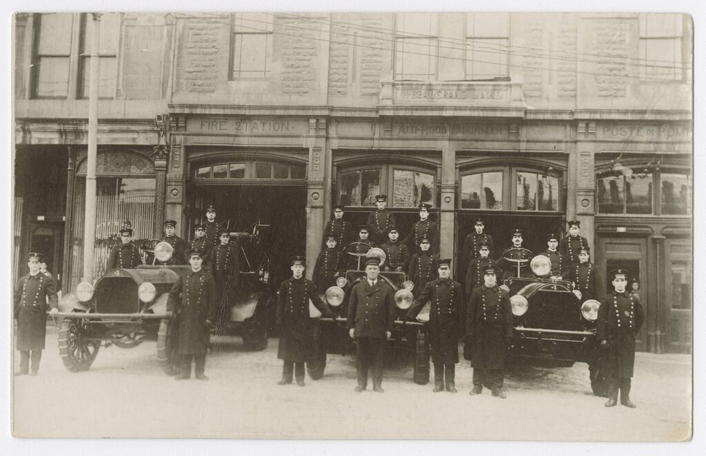 [Plusieurs pompiers de Montréal posant devant une caserne]