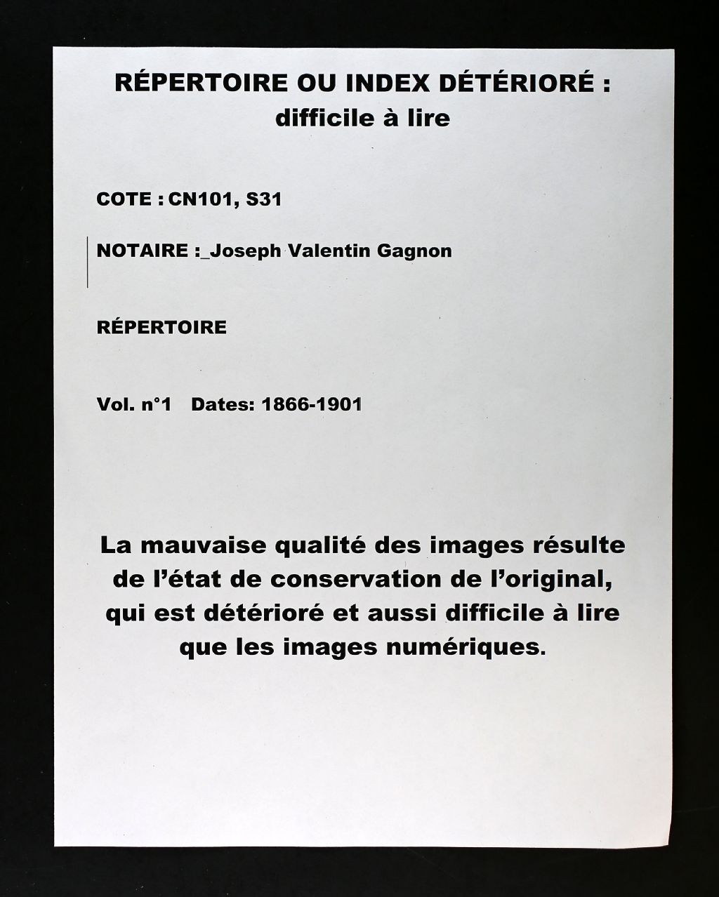 - Cette série témoigne de la vie quotidienne d'une partie de la population établie sur le territoire du Bas-Saint-Laurent et des actes légaux enregistrés chez le notaire Joseph-Valentin Gagnon. La vie économique, les moeurs et coutumes de la fin du XIXe siècle et du début du XXe siècle dans le Bas-Saint-Laurent peuvent être étudiés à l'aide de ces documents. De plus, les liens familiaux décrits dans les actes peuvent être utiles pour des études généalogiques. Enfin, on peut aussi retracer quelques références sur des marchands importants de cette région.Cette série comprend une sous-série des actes notariés contenant 4475 minutes notariales, une sous-série pour les répertoires, une sous-série pour l'index et une sous-série de documents administratifs. Le premier répertoire touche les années 1866-1901, le second, les années 1866 à 1877 et le dernier concerne les années 1902-1905. Les documents se présentent sous une forme normalisée, c'est-à-dire selon un modèle sériel qui renferme des informations sur les parties en présence et sur la nature de l'entente contractée