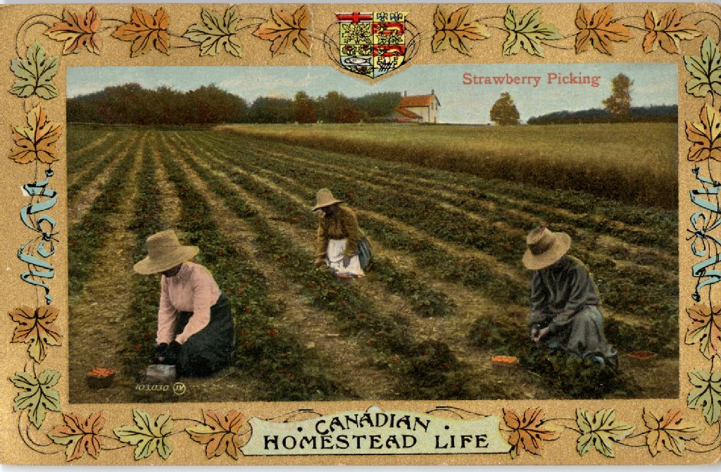 Carte postale montrant trois femmes affairées à la cueillette des fraises dans un champs cultivé. Loin, à l'horizon, on voit une maison ou une ferme
