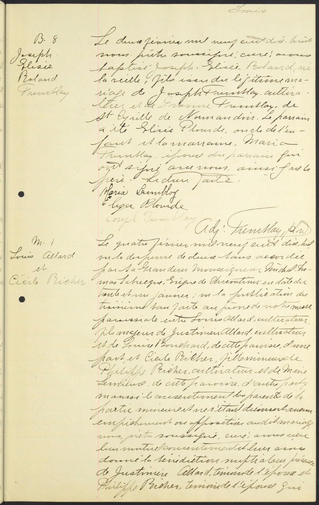 - Cette série regroupe les registres originaux de l'état civil, lesquels contiennent les enregistrements de baptêmes, de mariages et de sépultures consignés par le curé ou son représentant au cours de la période concernée par les documents.Outre les renseignements à caractère généalogique que nous pouvons y puiser, cette série peut constituer une source documentaire importante pour toute étude-statistique ou comparative sur les conditions de vie à différentes époques (mortalité infantile, espérance de vie) ou pour toute recherche portant sur l'occupation des terres (lieu de résidence), sur le mode vie (métiers et professions, statut et âge des époux), sur les classes sociales (titres des parties impliquées, témoins/amis/parents présents lors du mariage), sur des événements spéciaux (quelques mentions dans les sépultures) et sur des sujets à incidence médicale tels les maladies héréditaires (cause du décès)
