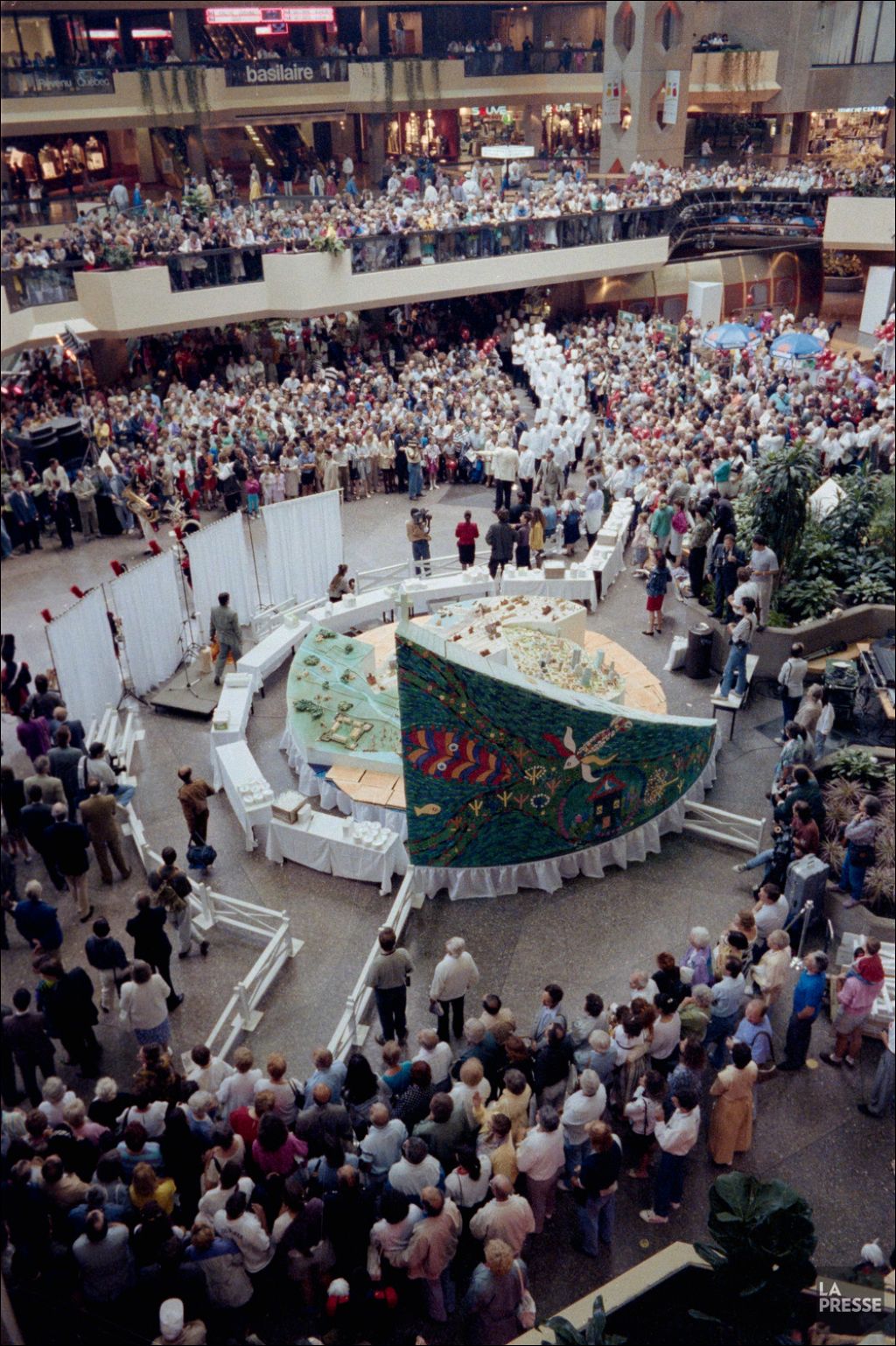- Le dossier porte sur un gigantesque gâteau offert aux Montréalais par la France et les Français de Montréal pour souligner le 350e de la ville. Les documents montrent, entre autres, des vues en plongée du gâteau exposé au Complexe Desjardins, le maire Jean Doré en compagnie de l'un des 58 (cinquante-huit) chefs pâtissiers ayant participé à la conception, et des éléments du gâteau représentant Montréal à diverses époques.