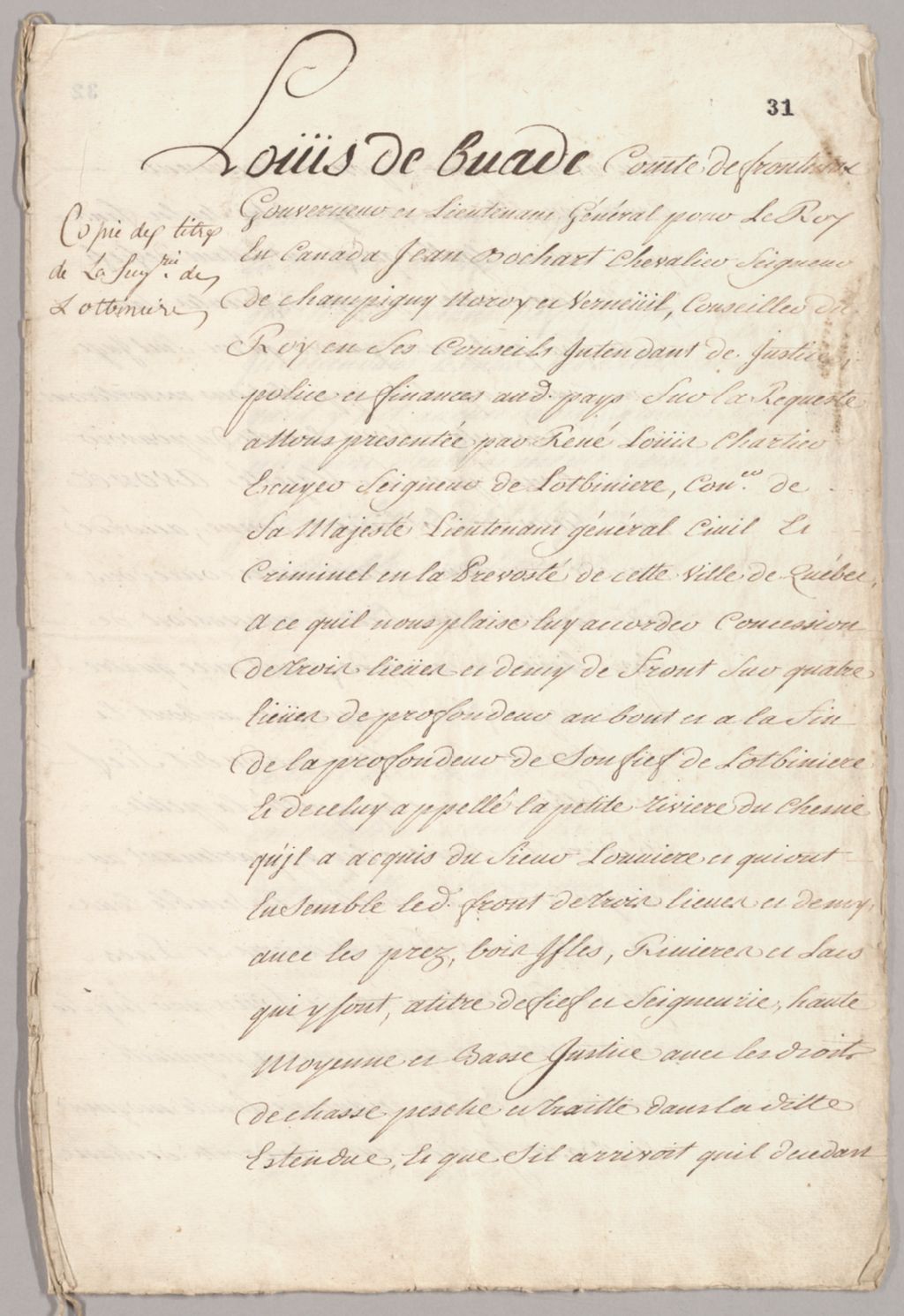Copie des titres de la seigneurie de Lotbinière. Concession de terre au seigneur de Lotbinière, René-Louis Chartier de Lotbinière, par Louis de Buade, comte de Frontenac et Jean Bochart, seigneur de Champigny