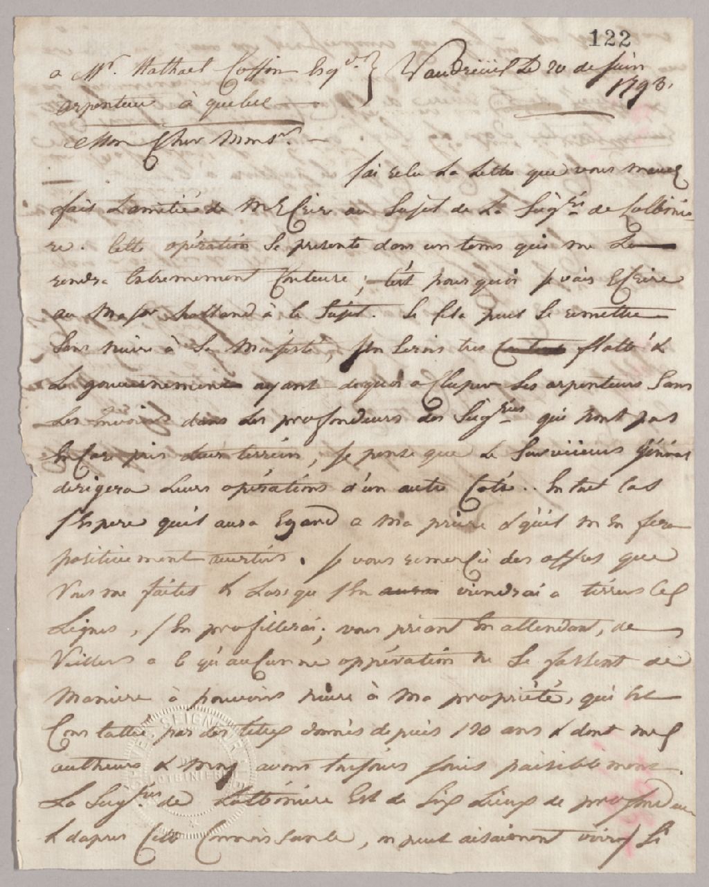 - Délimitation de la seigneurie de LotbinièreLettre probablement écrite par le seigneur, Michel-Eustache-Gaspard-Alain Chartier de Lotbinière. Ce semble être un brouillon, non signé.Contenu semblable au document P351,S12, P15