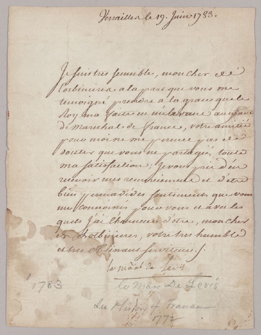 Lettre du Maréchal de Lévis [François Gaston de Lévis] à monsieur de Lotbinière, Versailles, 19 juin 1783, Archives nationales à Québec, Fonds Famille Joly de Lotbinière, (03Q,P351,S11,P19).