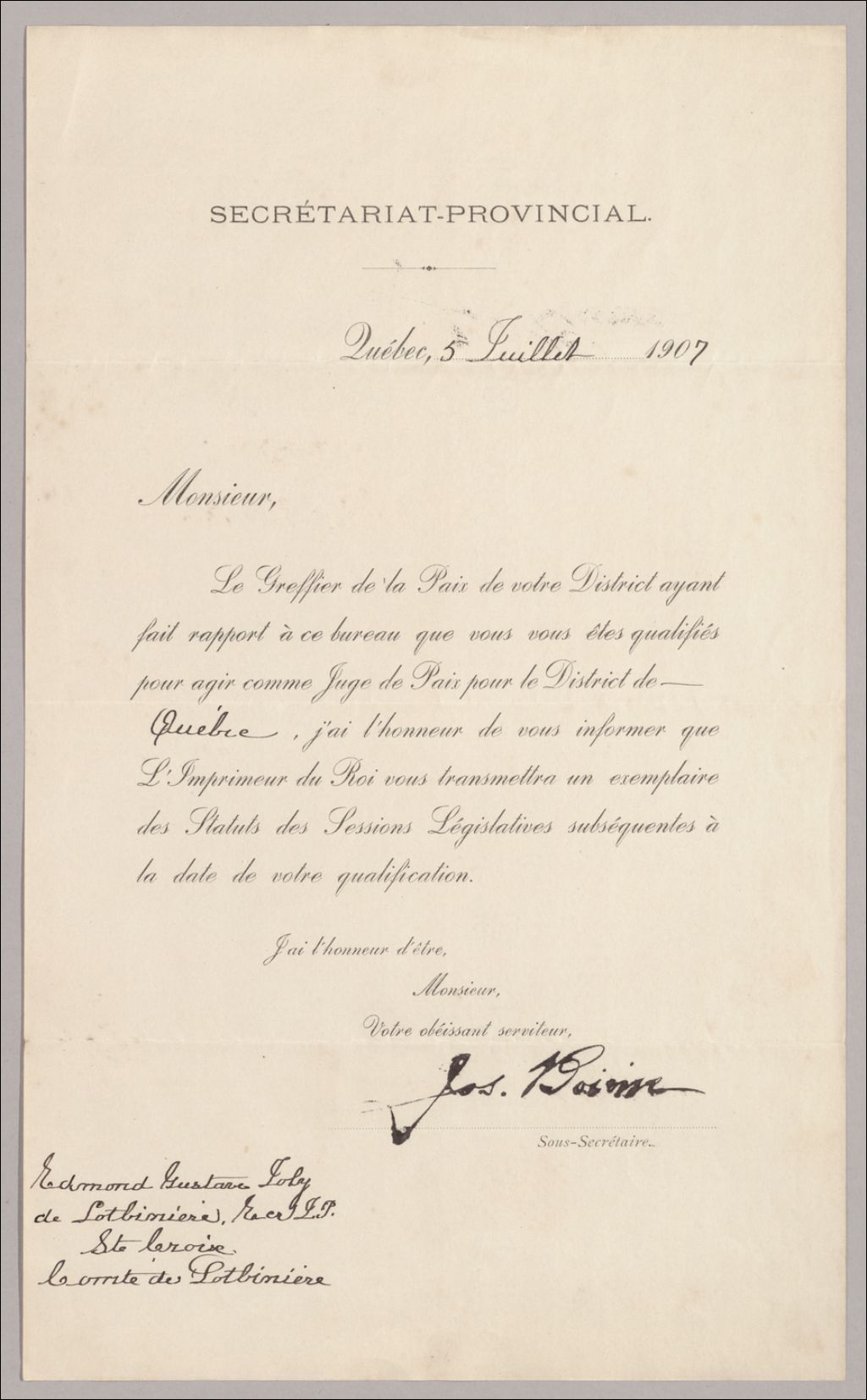 Correspondance entre Joseph [Boivin?], sous-secrétaire de la Province, et Edmond-Gustave Joly de Lotbinière, Québec, 5 juillet 1907, Archives nationales à Québec, Fonds Famille Joly de Lotbinière, (03Q,P351,S6,D27).