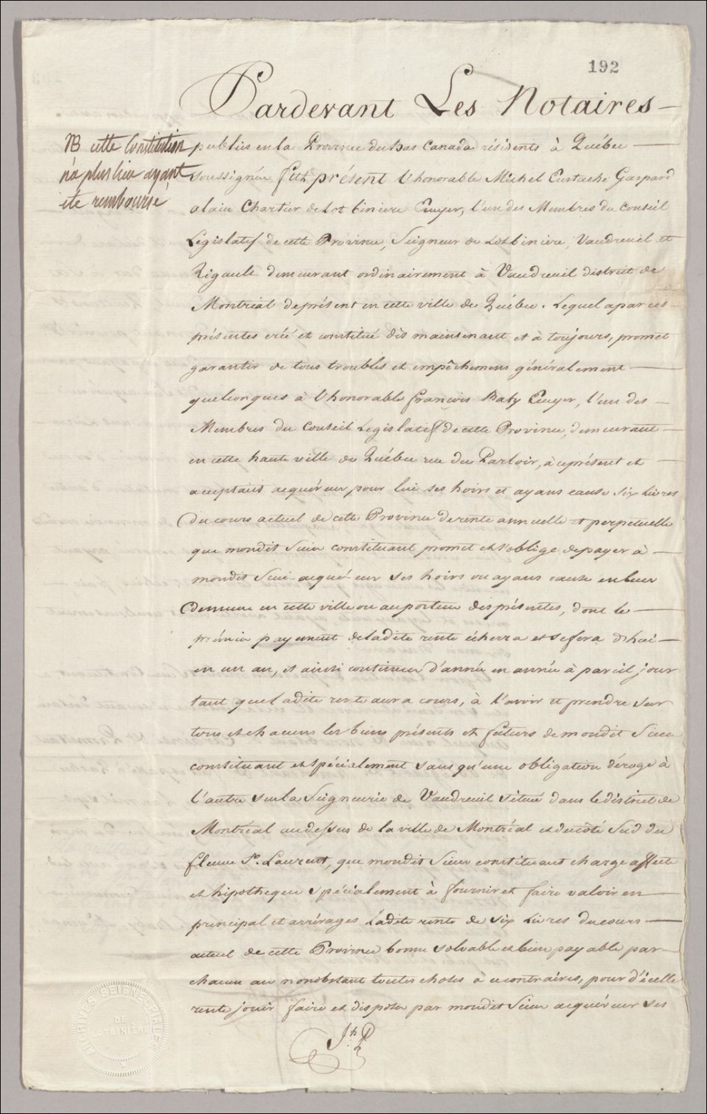 Constitution de rente par Michel-Eustache-Gaspard-Alain Chartier de Lotbinière en faveur de François Baby, 14 mai 1798, Archives nationales à Québec, Fonds Famille Joly de Lotbinière, (03Q,P351,S12,P31).