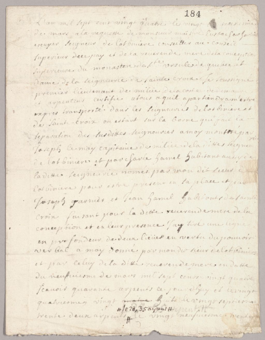 Procès-verbal d’arpentage et bornage de la seigneurie de Sainte-Croix et de celle de Lotbinière, fait à la demande du seigneur Eustache Chartier de Lotbinière, et de la révérende mère de la conception supérieure du monastère de Sainte-Ursule de Québec et dame de la seigneurie de Sainte-Croix