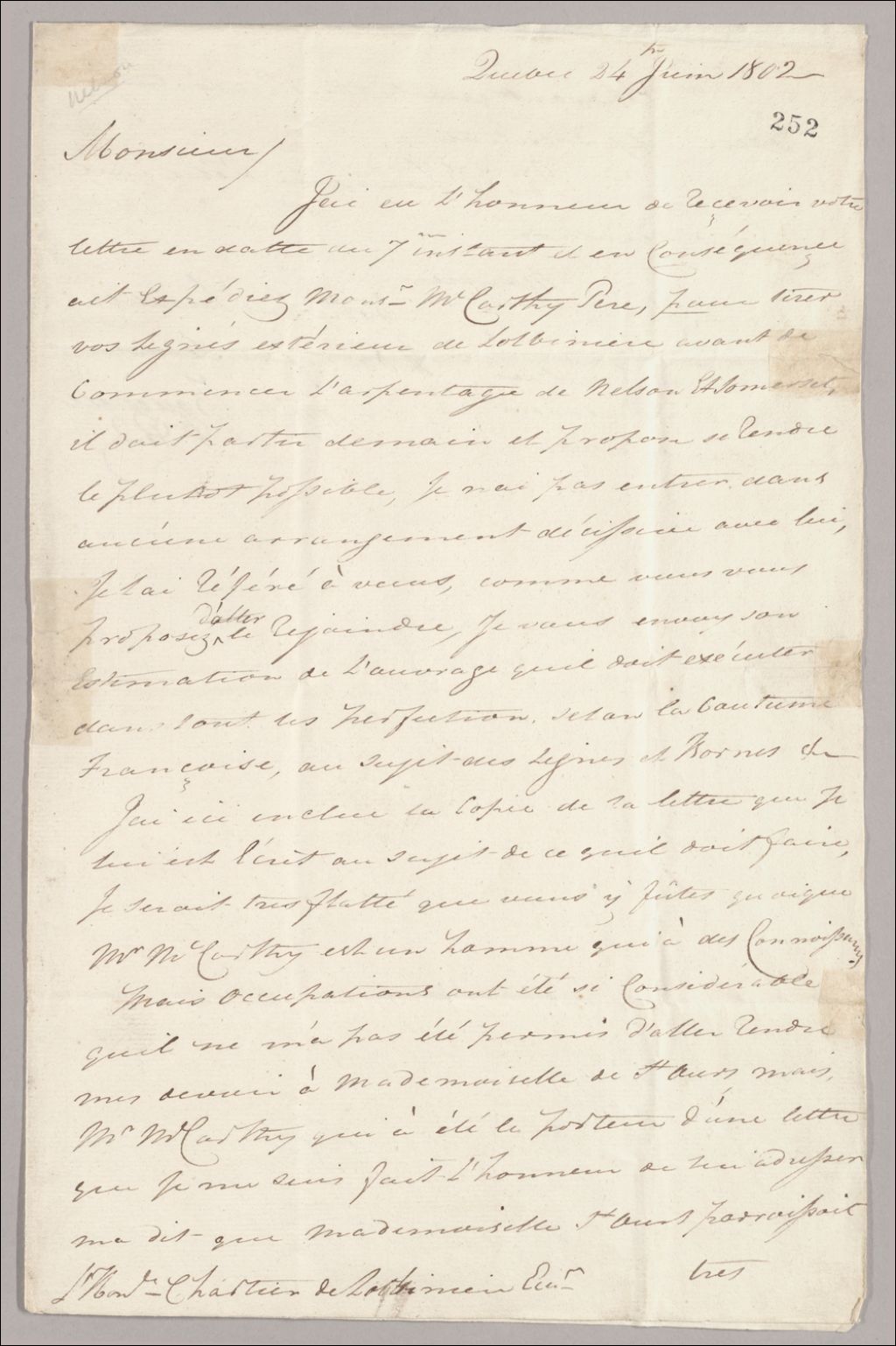 Lettre de Joseph Bouchette, Québec, à Michel-Eustache-Gaspard-Alain Chartier de Lotbinière, Vaudreuil
