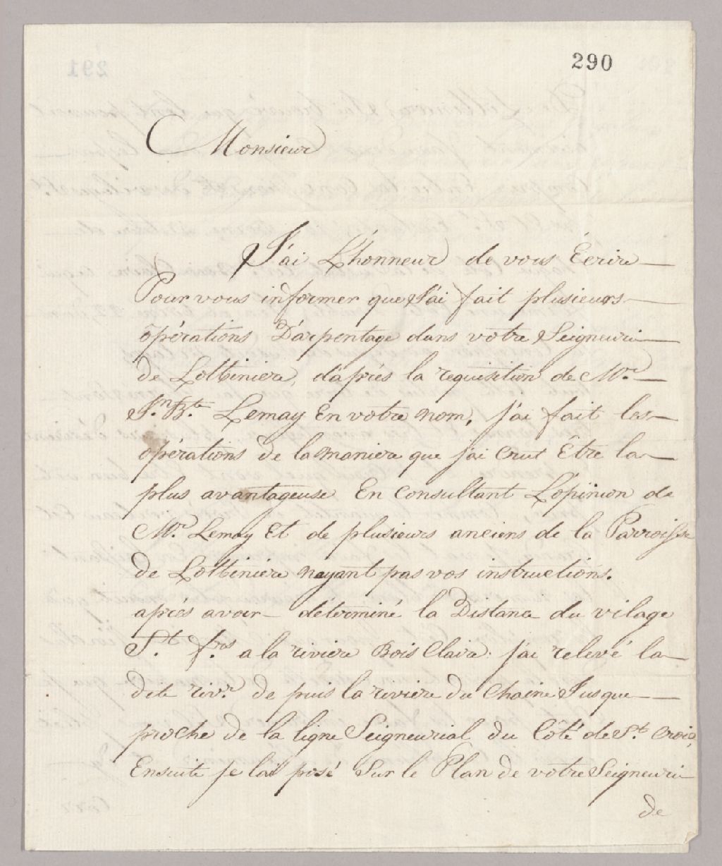 Lettre de Louis Legendre, arpenteur, au seigneur [Michel-Eustache-Gaspard-Alain Chartier de Lotbinière], Québec