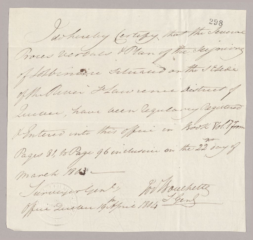 Certification par Joseph Bouchette confirmant l’enregistrement du procès-verbal et plan d’arpentage de la seigneurie de Lotbinière dans son livre