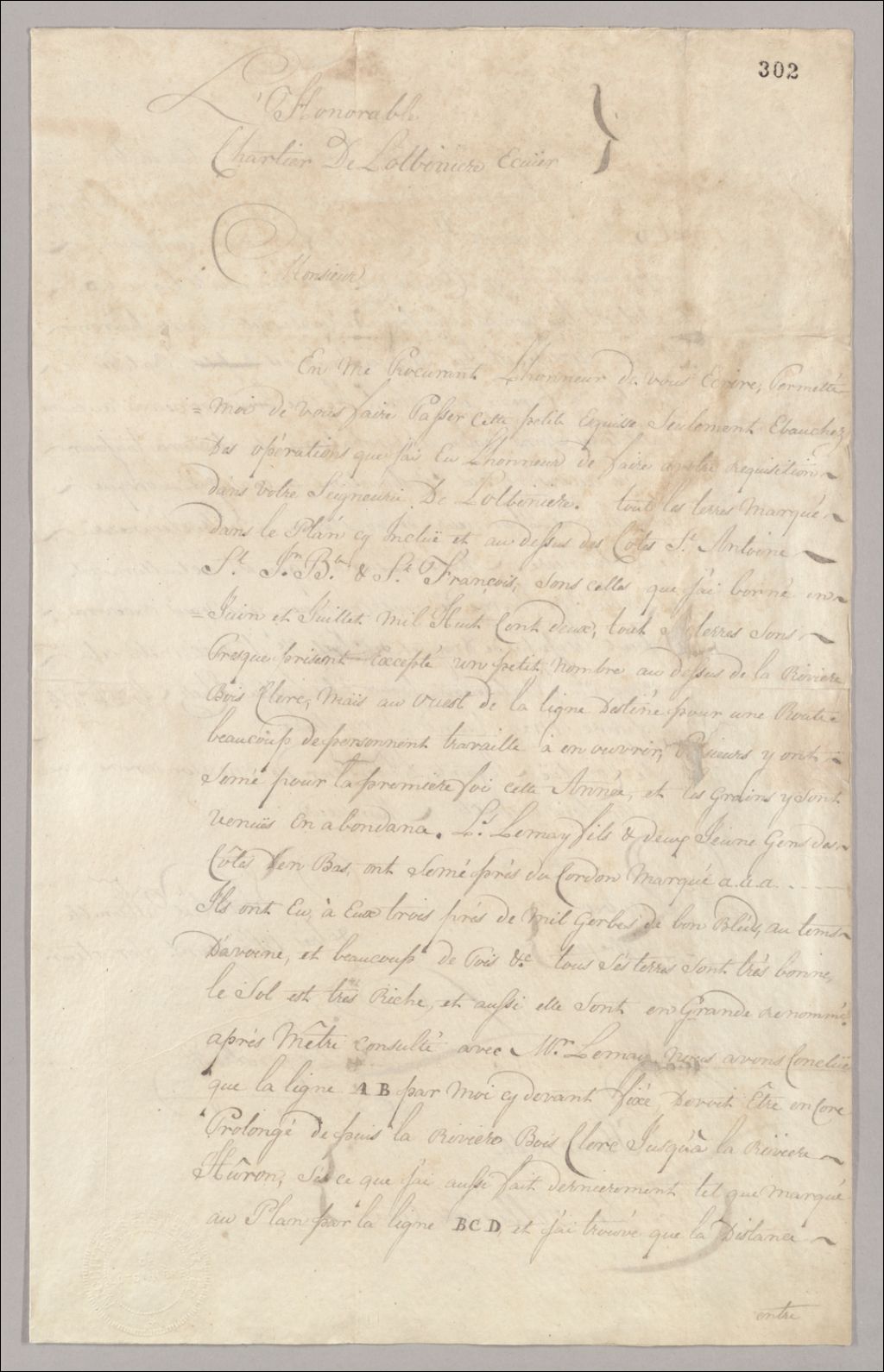 - Correspondance en rapport avec l¿arpentage de la seigneurie de Lotbinière.Fait référence à une esquisse qui n¿est pas jointe au document