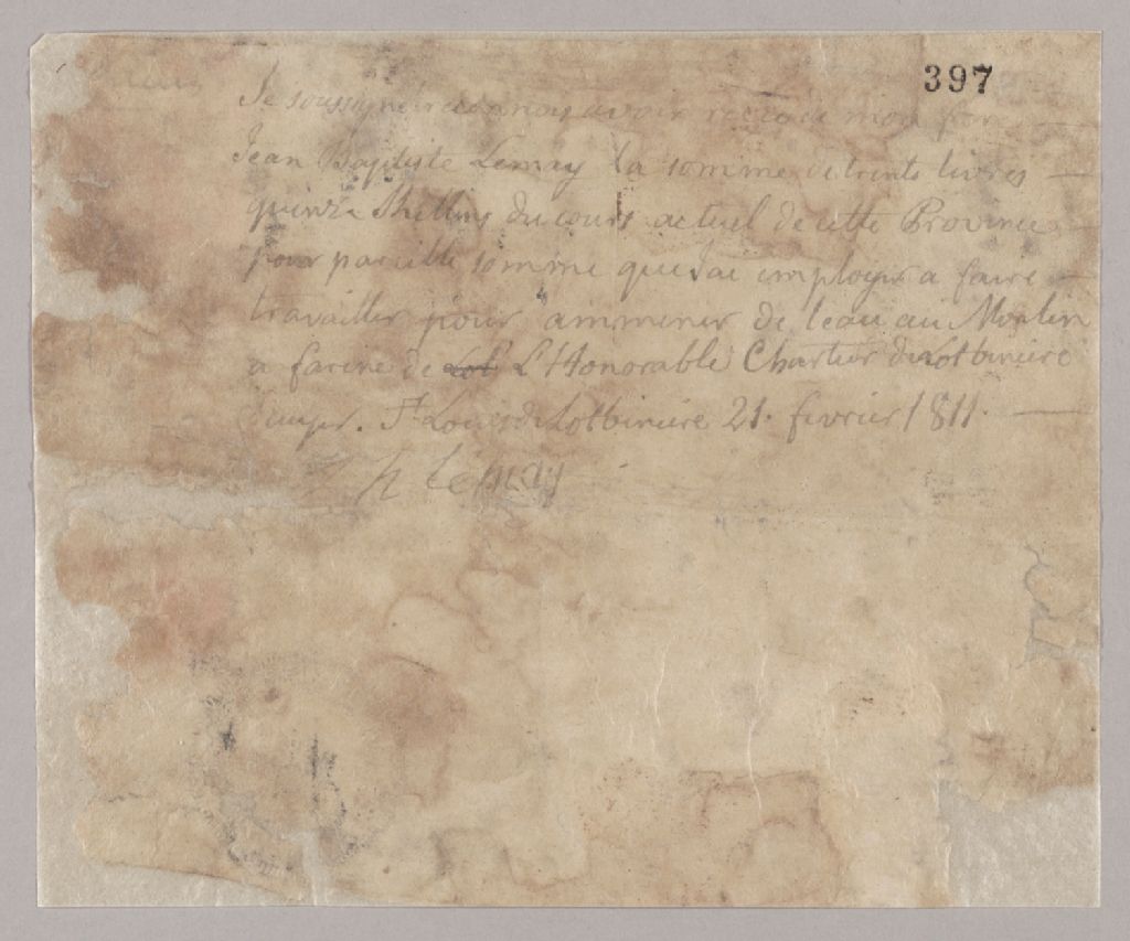 Reçu de Joseph Lemay, Saint-Louis de Lotbinière, 21 février 1811, Archives nationales à Québec, Fonds Famille Joly de Lotbinière, (03Q,P351,S12,P84).