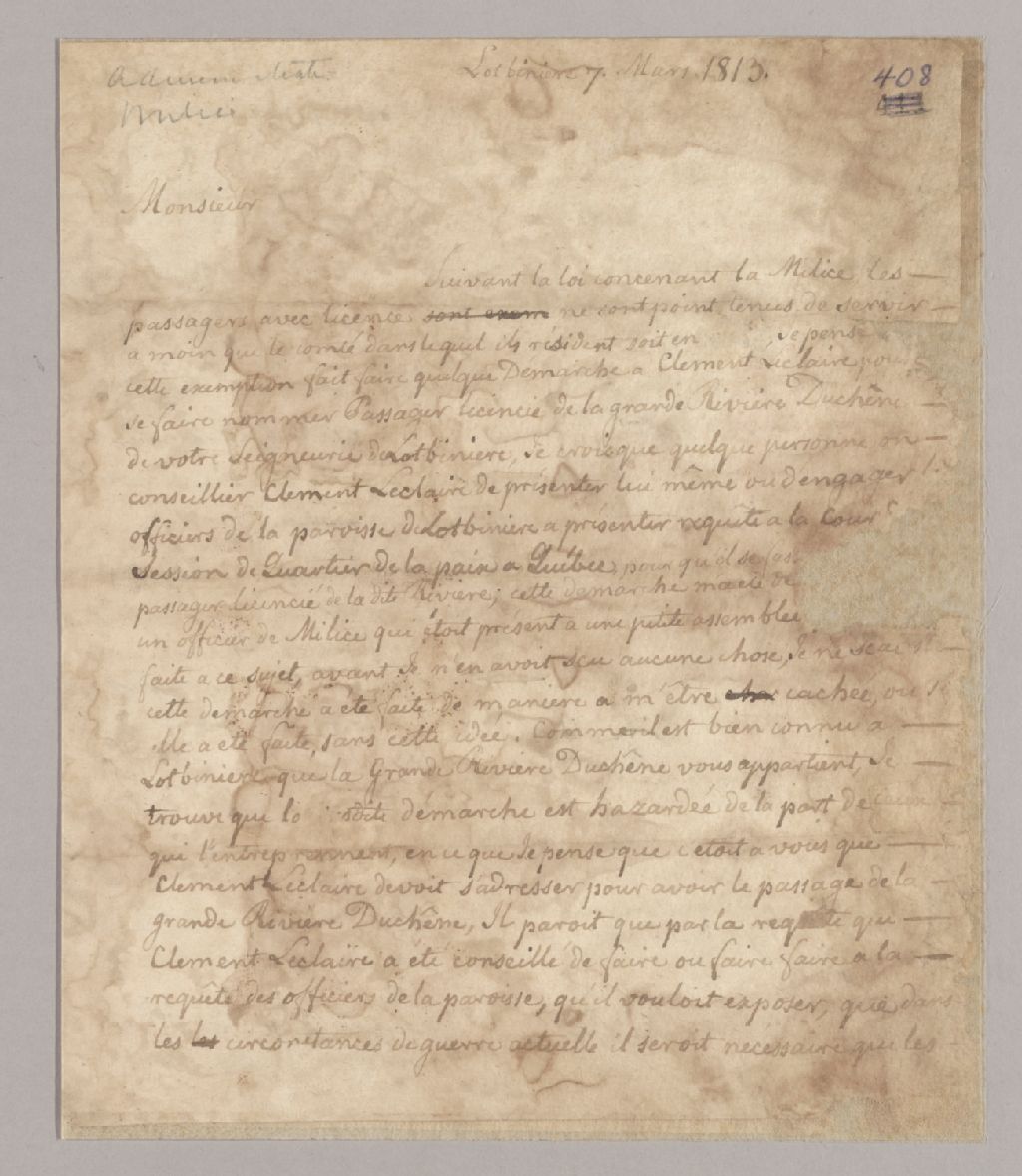 Lettre de A. C. de La Chevrotière, Lotbinière, à [Michel-Eustache-Gaspard-Alain Chartier de Lotbinière], Montréal, 7 mars 1813, Archives nationales à Québec, Fonds Famille Joly de Lotbinière, (03Q,P351,S12,P88).