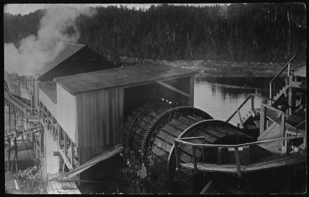 Cette pièce montre à droite le "trasel" ou convoyeur qui amène le bois à l'usine, l'escalier couvert et le "lorry" qui monte la pulpe au "line cling". En arrière-plan : le barrage. Il fournit l'électricité au moulin et à Clarke City