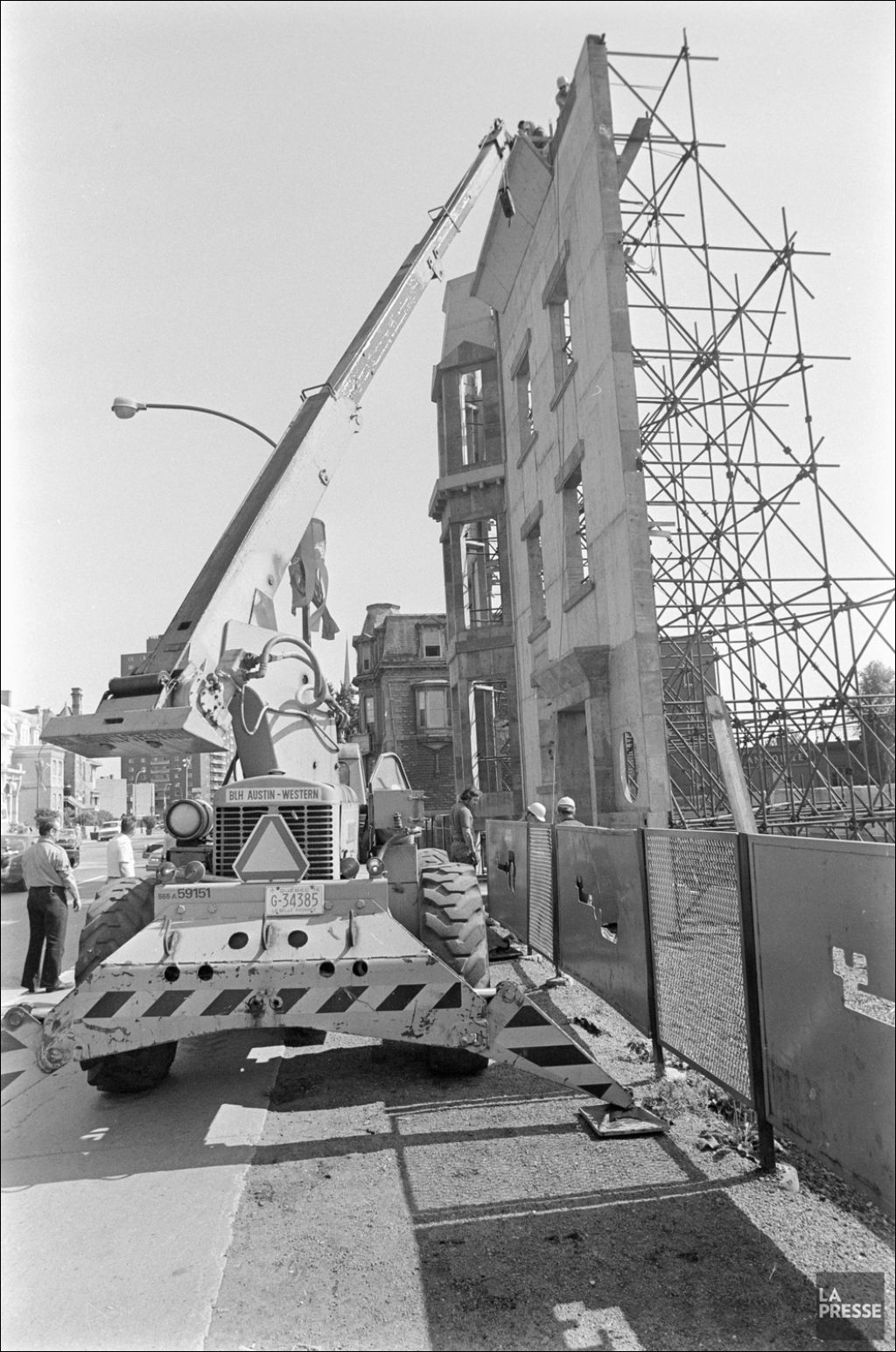 - Le dossier porte sur les reportages intitulés : Démolition de "Corridart" ; Portrait de R. Demers de l'Association des gens de l'air du Québec ; Entrevue avec Ernest Pleau, ancien directeur du Service de police de Montréal. Les documents montrent le démantèlement, à l'aide d'une grue mobile, de l'oeuvre "Maisons de la rue Sherbrooke" de Melvin Charney qui consiste en une façade d'immeuble à logements soutenue par des échafaudages à l'angle des rues Sherbrooke et Saint-Urbain