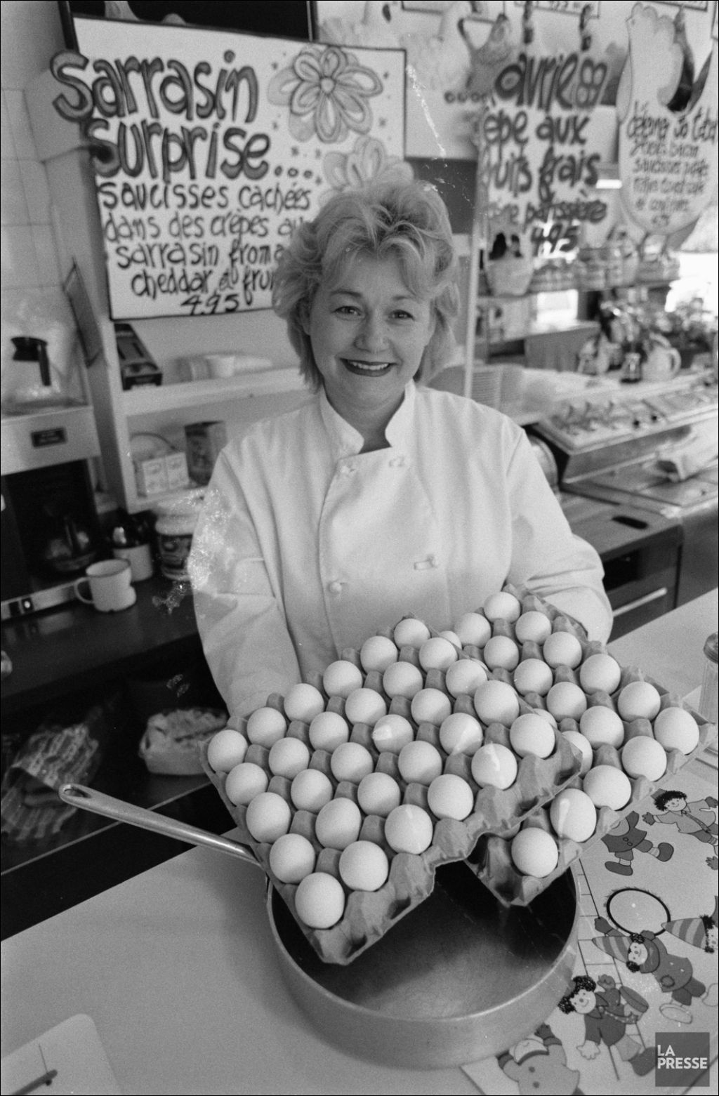 Le dossier illustre Cora Tsouflidou, propriétaire de la chaîne Cora déjeuners, au comptoir de son restaurant