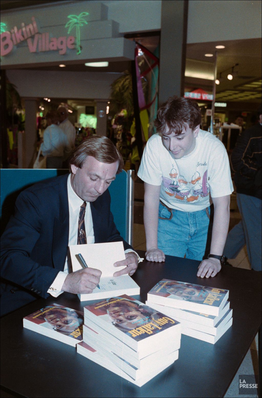 Le dossier illustre Guy Lafleur lors d'une séance d'autographes dans le cadre du lancement du livre "Guy Lafleur : l'ombre et la lumière" de Georges-Hébert Germain.