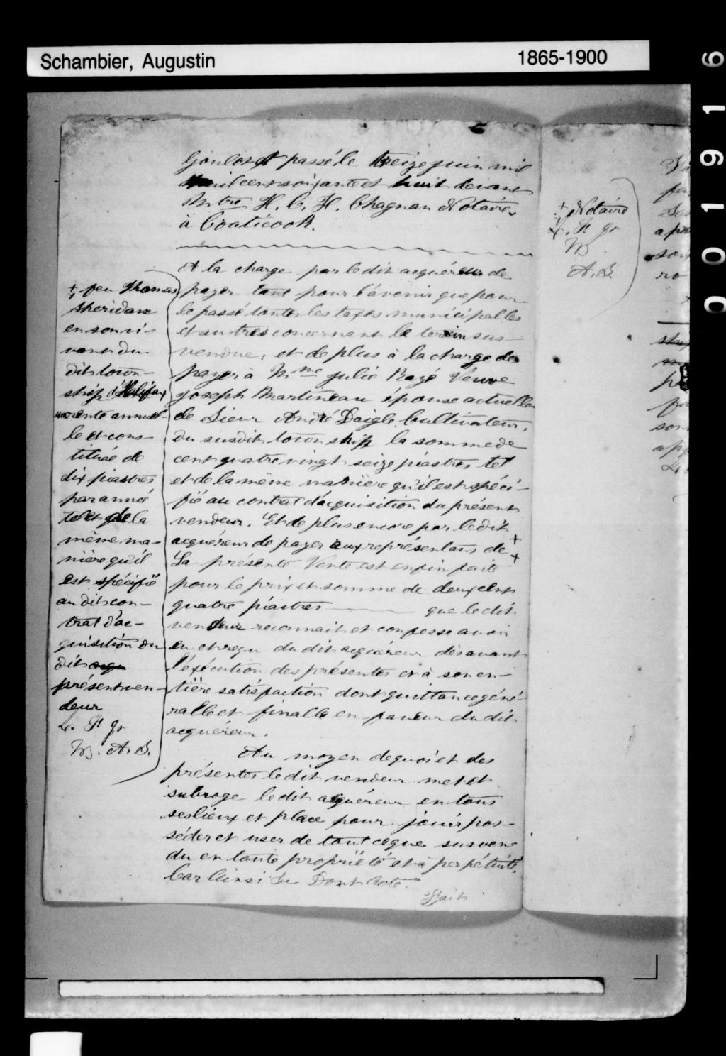 - Cette série regroupe les minutes notariales du greffe du notaire Augustin Schambier (10889 pièces numérotées) et un répertoire original pertinent.Outre les informations spécifiques aux parties impliquées dans chacun des contrats consignés dans ce greffe, lesquelles peuvent être utilisées, entre autre, dans le cadre de recherches à caractère généalogique, cette série constitue, dans un premier temps, une source documentaire intéressante sur le mode de fonctionnement de la société. D'autre part, prises dans leur ensemble, les données colligées dans ces documents officiels à contenu administratif et légal peuvent également constituer une source documentaire des plus révélatrices sur le mode et les conditions de vie de la population pendant cette période (métiers et professions mentionnés aux contrats, inventaires de biens, testaments), sur les classes sociales (mention de titres correspondant au rang social des parties concernées tels [...]
