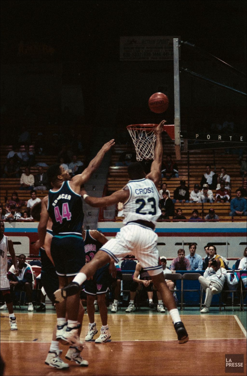 Le dossier montre une partie de basketball entre les Dragons de Montréal et les Slam de Saskatoon à l¿Auditorium de Verdun. On y voit notamment Roy Marble.