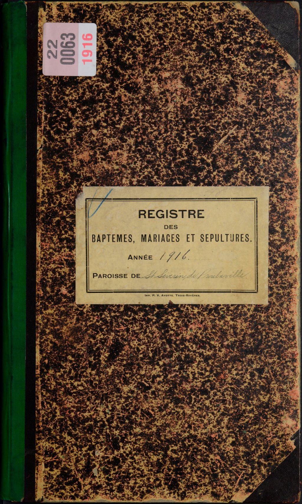 Cette série regroupe les registres originaux de l'état civil, lesquels contiennent les enregistrements de baptêmes, de mariages et de sépultures consignés par le curé ou son représentant au cours de la période concernée par les documents.Outre les renseignements à caractère généalogique que nous pouvons y puiser, cette série peut constituer une source documentaire importante pour toute étude-statistique ou comparative sur les conditions de vie à différentes époques (mortalité infantile, espérance de vie) ou pour toute recherche portant sur l'occupation des terres (lieu de résidence), sur le mode de vie (métiers et professions, statut et âge des époux), sur les classes sociales (titres des parties impliquées, témoins/amis/parents présents lors d'un mariage), sur des évènements spéciaux (quelques mentions dans les sépultures) et sur des sujets à incidence médicale tels les maladies héréditaires (cause du décès)