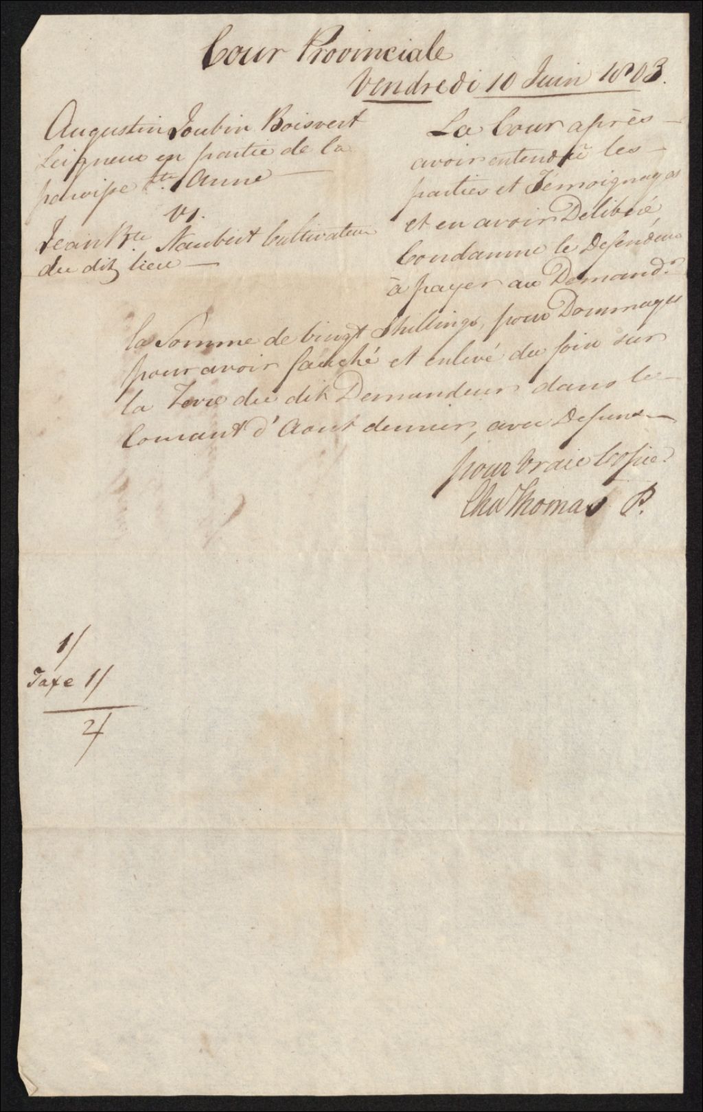 - Sentence (coupe de foin illégale) entre Augustin Joubin-Boisvert et Jean-Baptiste Nobert par Thomas, juge