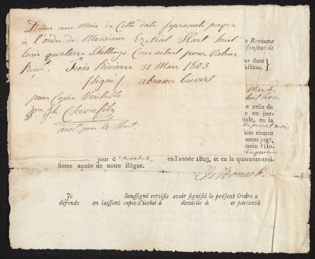 - Assignation (à comparaître) entre Augustin Joubin-Boisvert et Abraham Boisvert et Ezechiel Hart par Thomas, huissier