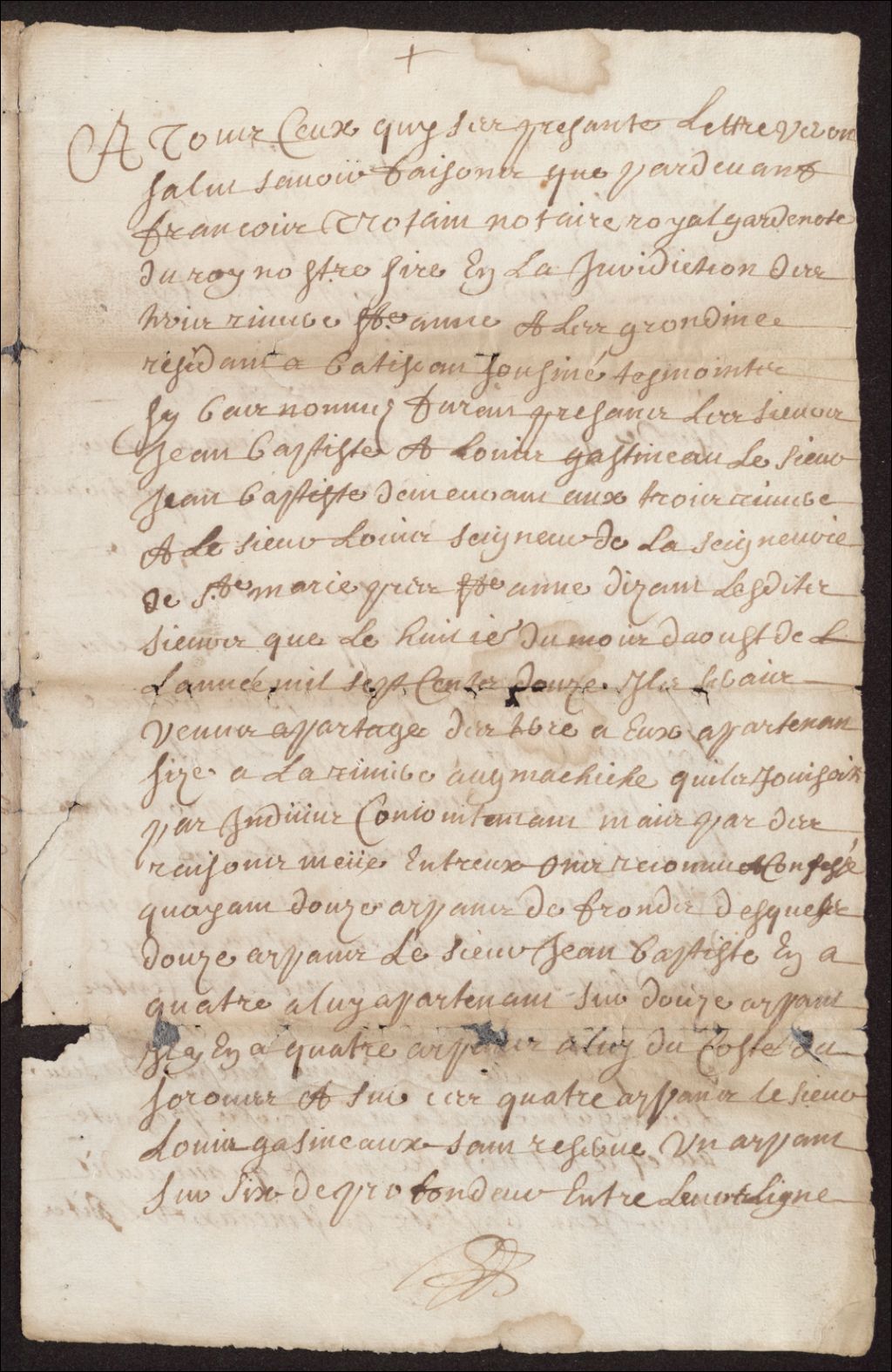 - Accord* Document incompletentre Louis Gastineau et Jean-Baptiste Gastineau par François Trottain dit Saint-Seürin, notaire